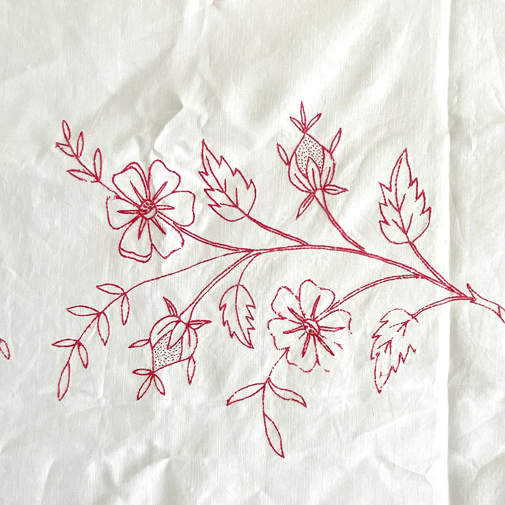 Beautiful hand-stitched red work panel - probably meant as a shelf linr - but could be used on a table. The red work - mostly in good condition, but there are stitches missing here and there - is stitched on a cool, crisp piece of old linen.