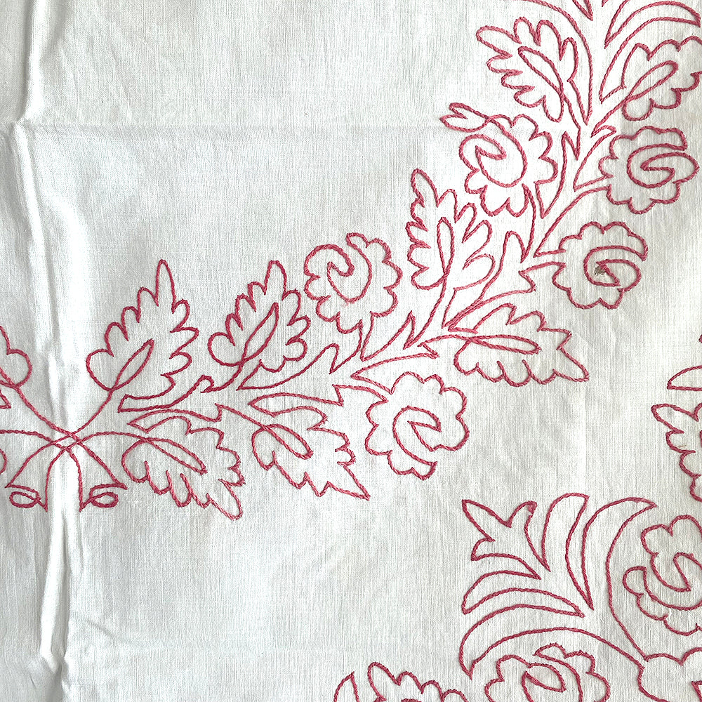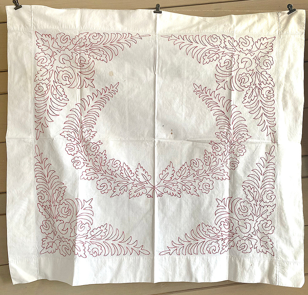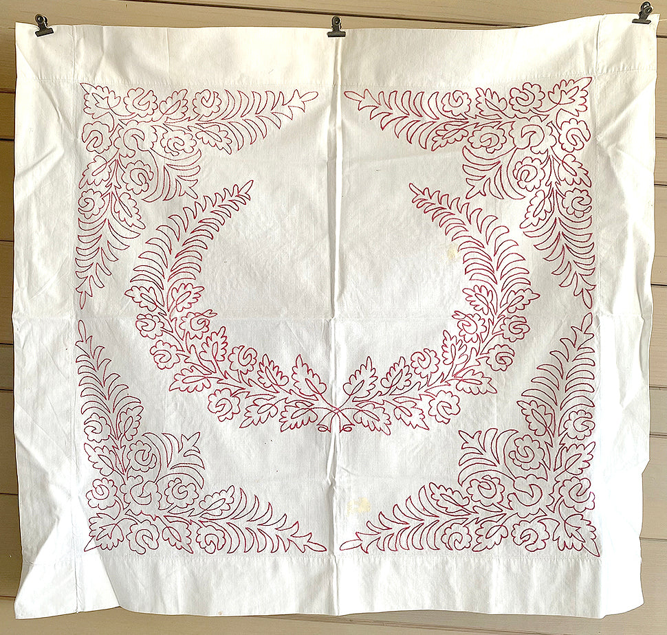 These cotton panels are not shams - but probably sham or pillow covers - meant to be laid over pillows on the bed. Small hand-stitched floral wreath and floral design on white cotton. This is a pair of covers - they are in ok shape with a few spots and small holes here and there. On one cover, there seems to be a bit of paint smudges - not sure if they will come out or not.