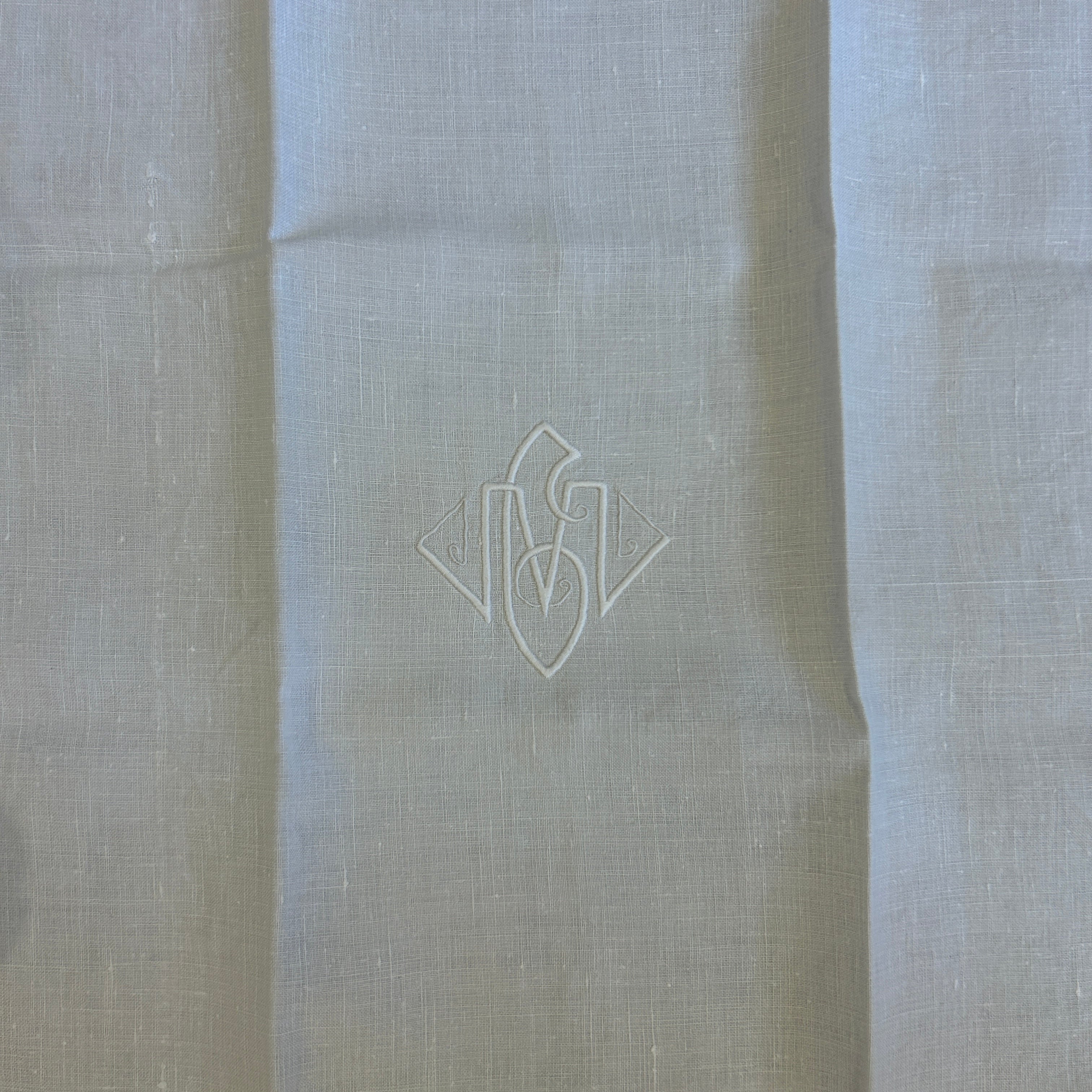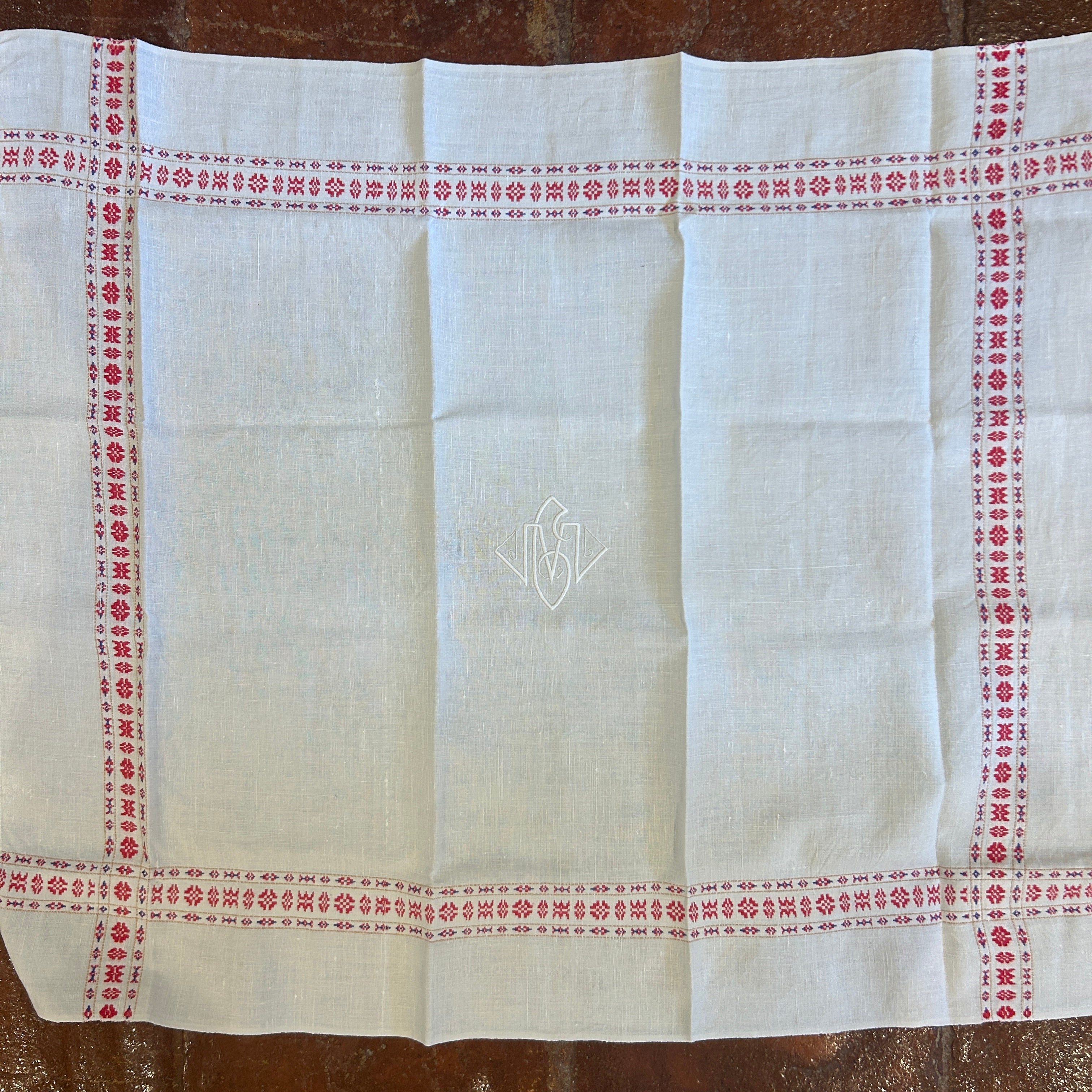 Stunning set of nine white linen napkins (or cloths) with a red woven edge and a hand-stitched CM (or MC) monogram. Freshly washed and pressed, these are some of the most wonderful cloths I have found in a long time!