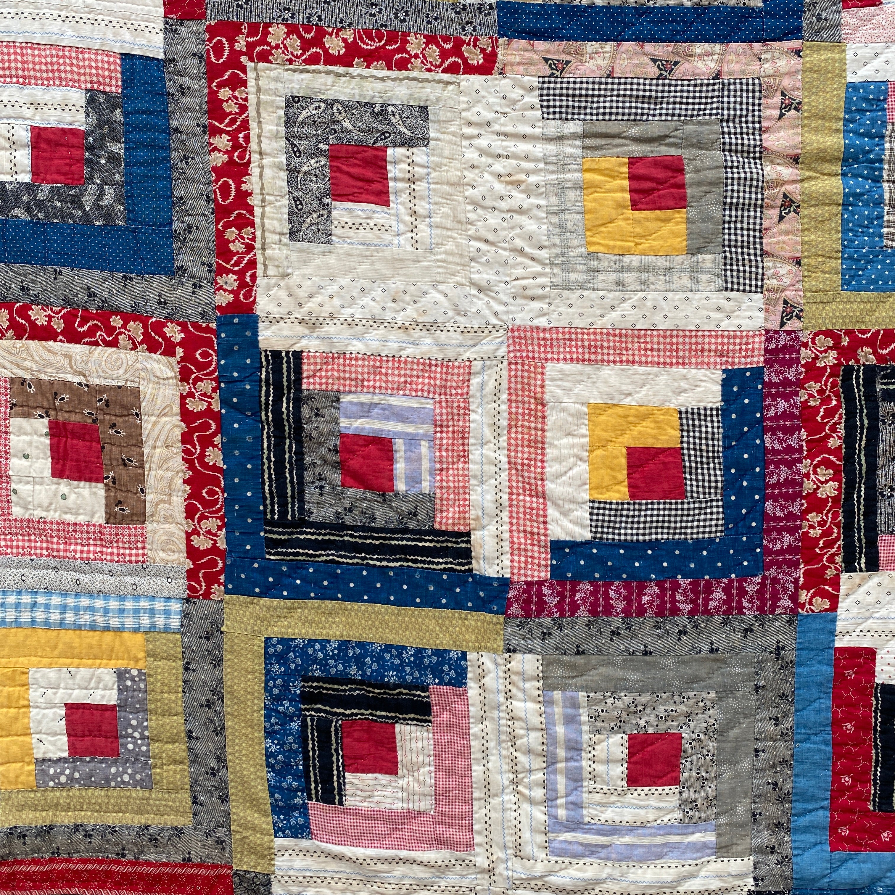 This antique Log Cabin Quilt is a movie quilt! It has great color, brightness and is visually stunning! Measuring 68" x 84" this quilt is in pretty good shape - although it has seen it's years of use. 80 8" log cabin blocks each with the center red hearth and all in good shape save for a small tear here or there. There is fraying throughout the binding. This quilt is hand pieced and hand sewn with a medium weight cotton batting. The backing is a fresh stripe - dating back to the early 1900's. Well worn and soft - this quilt could be a cutter or used gently on a bed.