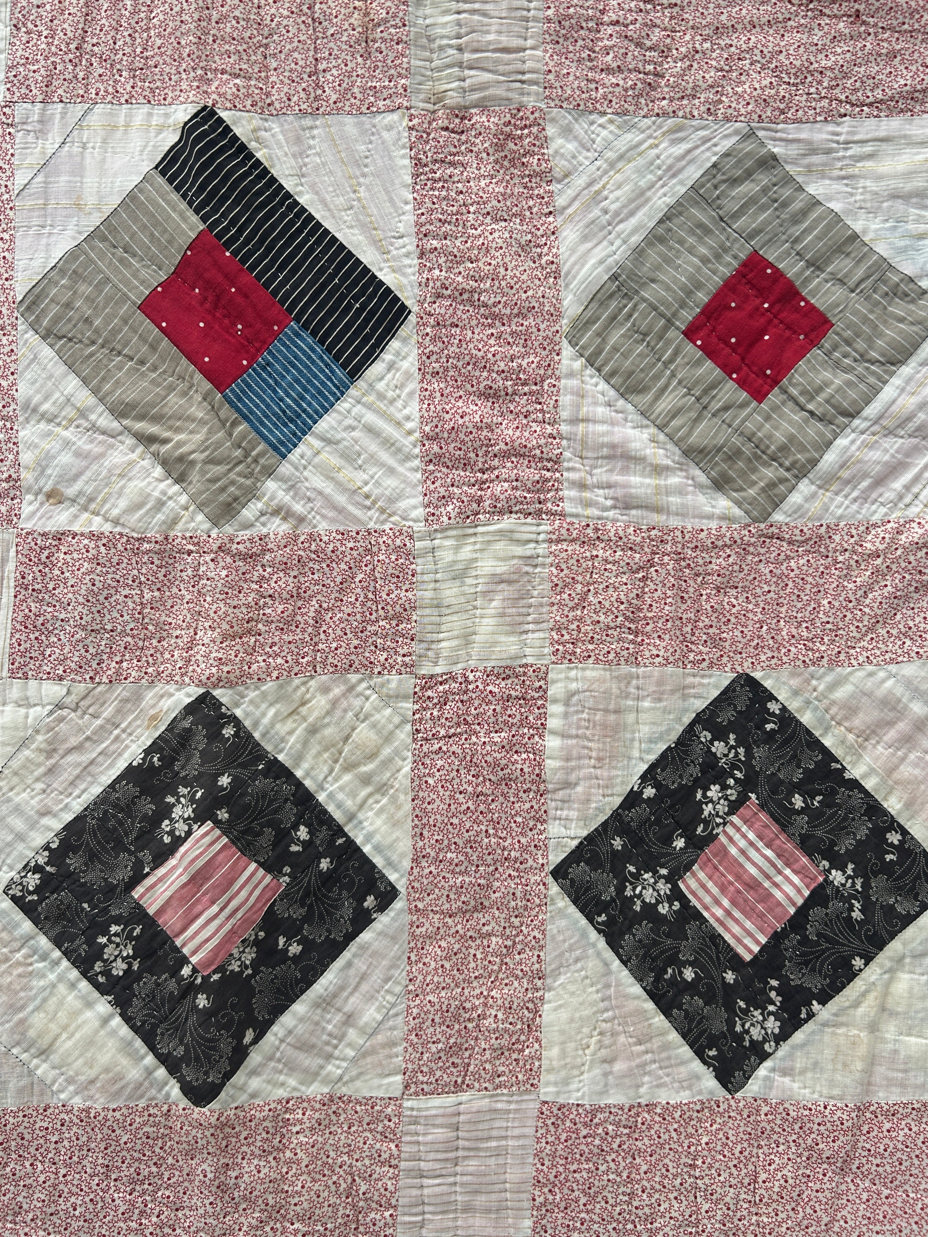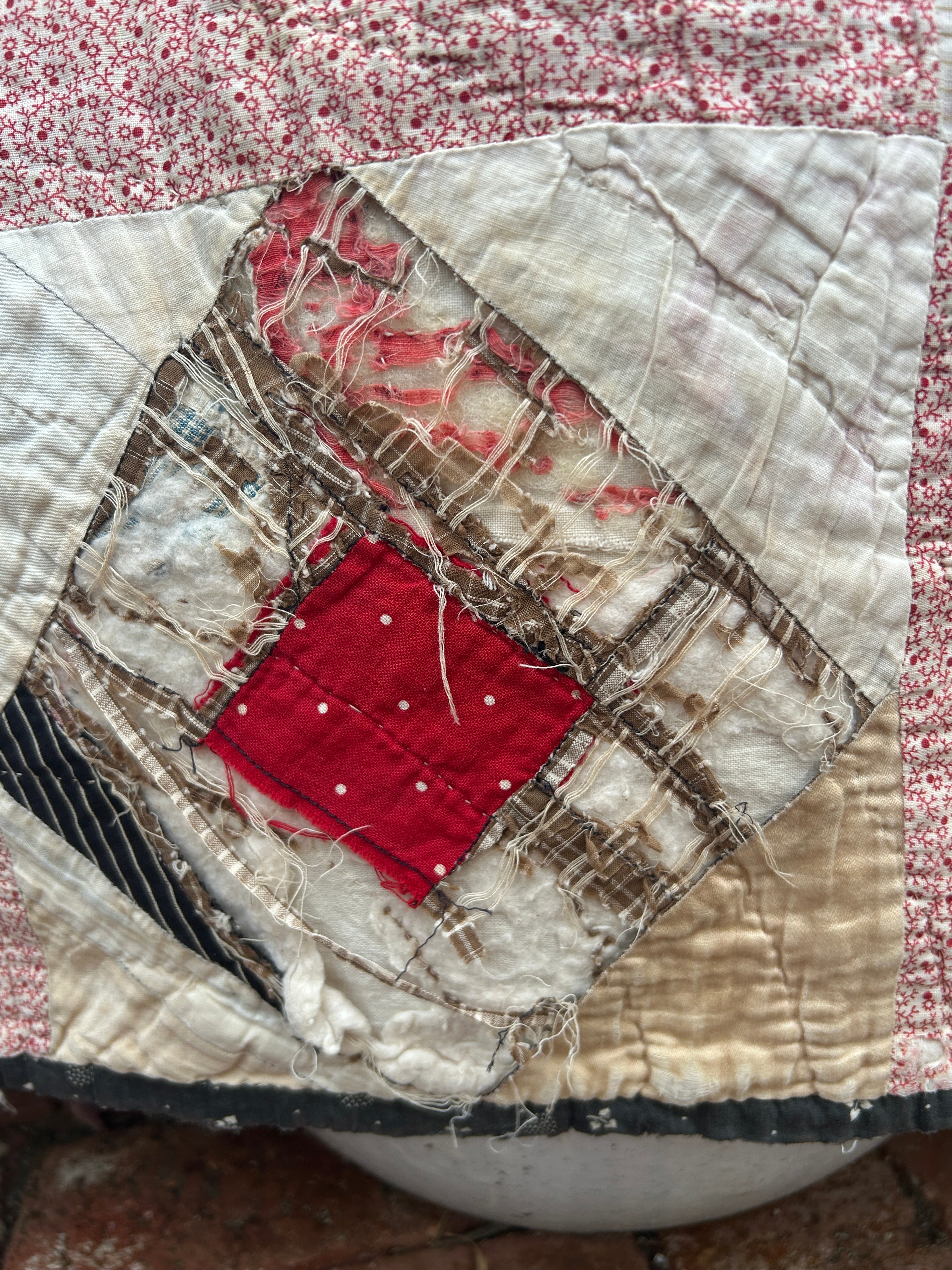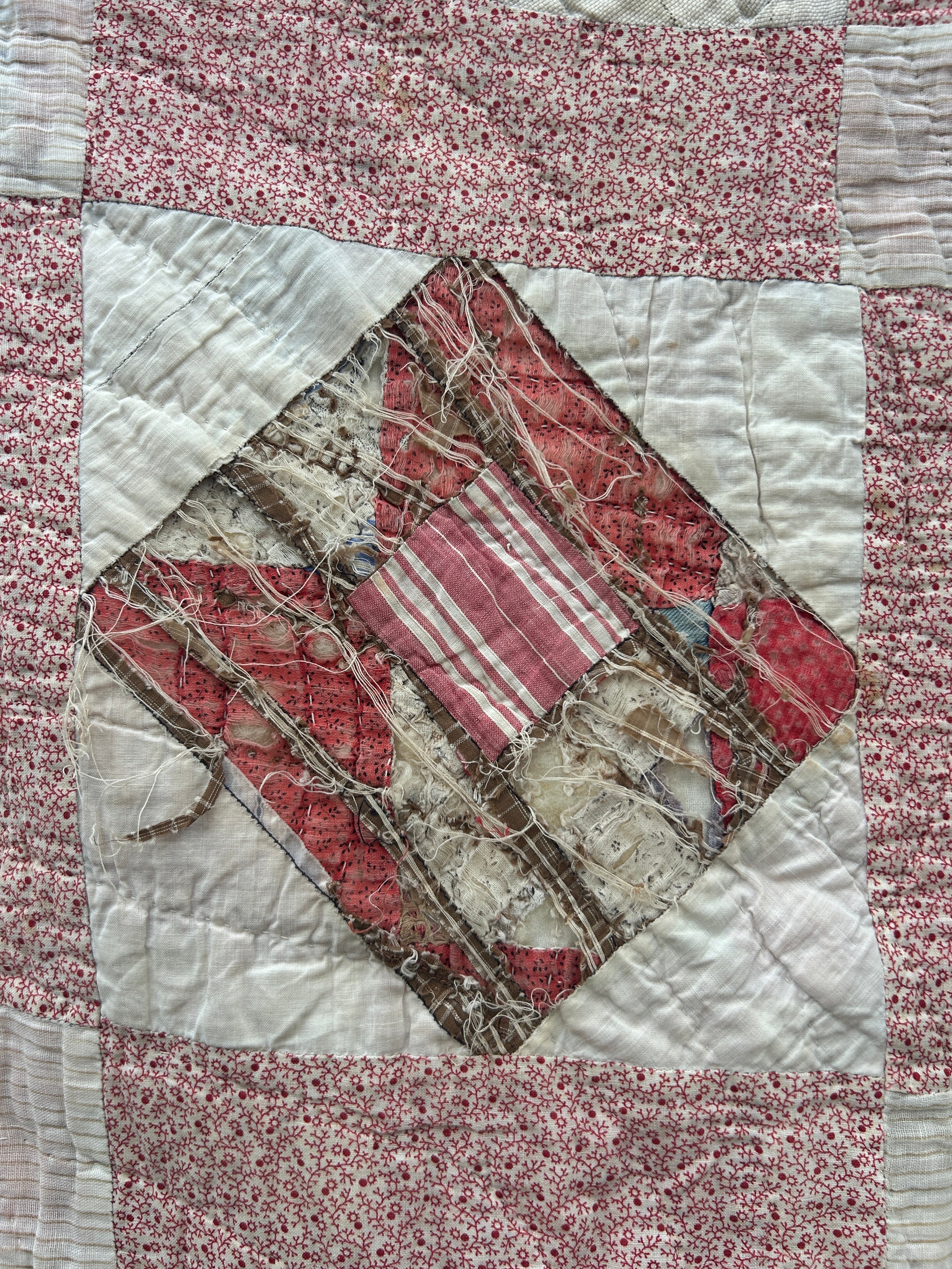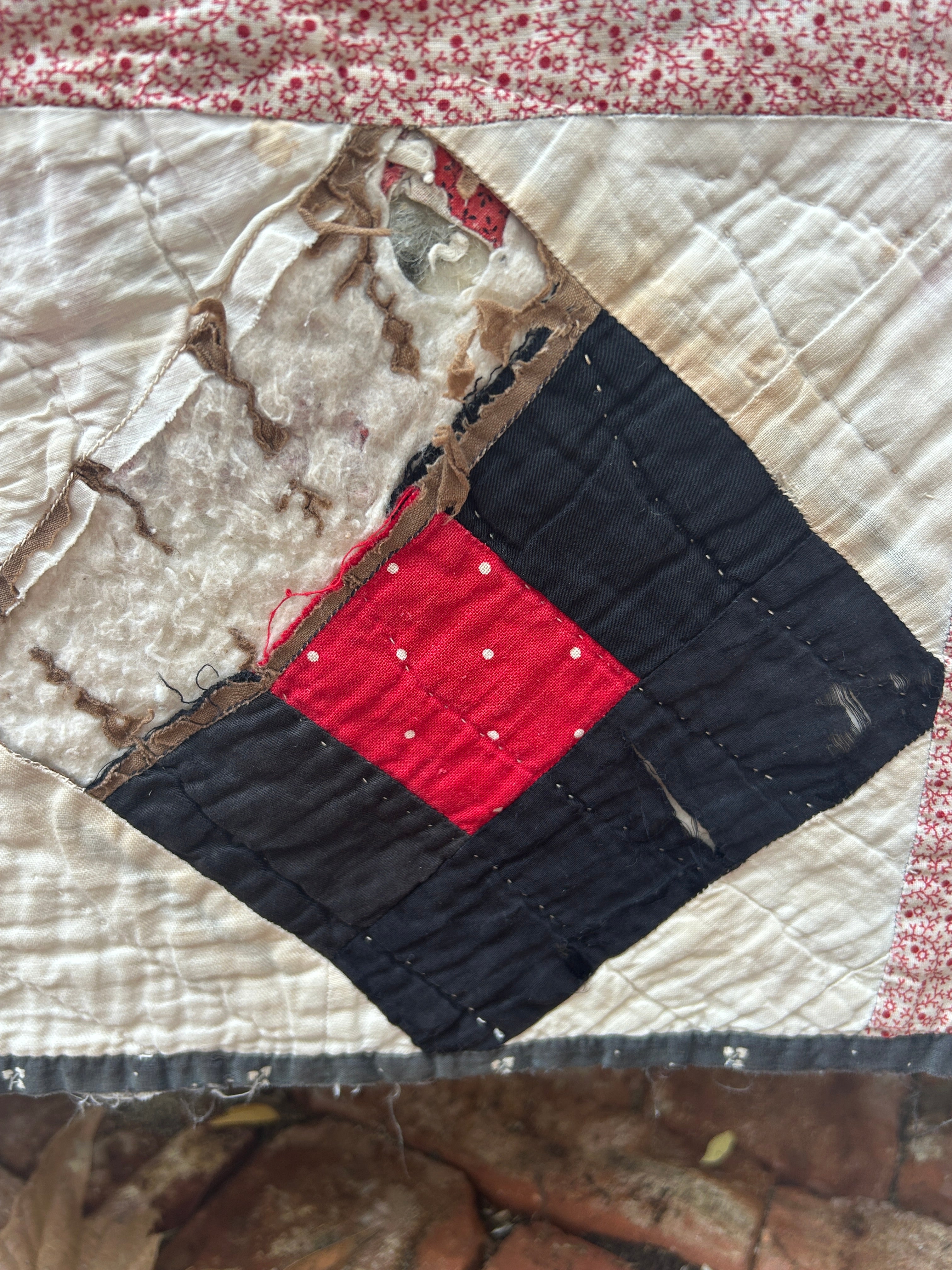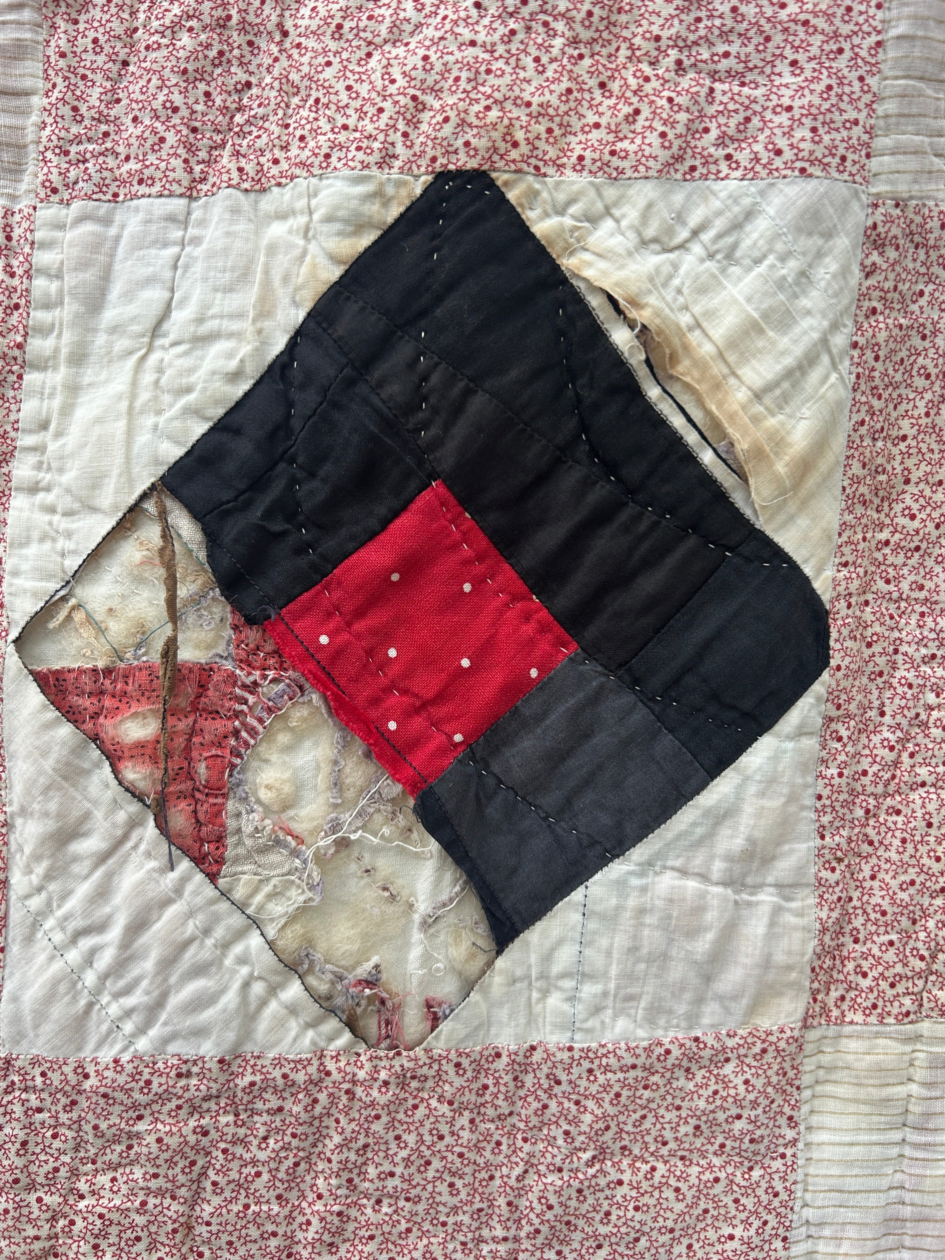 Every once in a while we come across a quilt that has been made to cover an older quilt. We will leave the picking up to you if you decide to look for the quilt underneath! This old quilt is not in great shape and could be a fun cutter - who knows, maybe you will find something beautiful underneath this quilt. There is damage on many of the blocks and the binding.