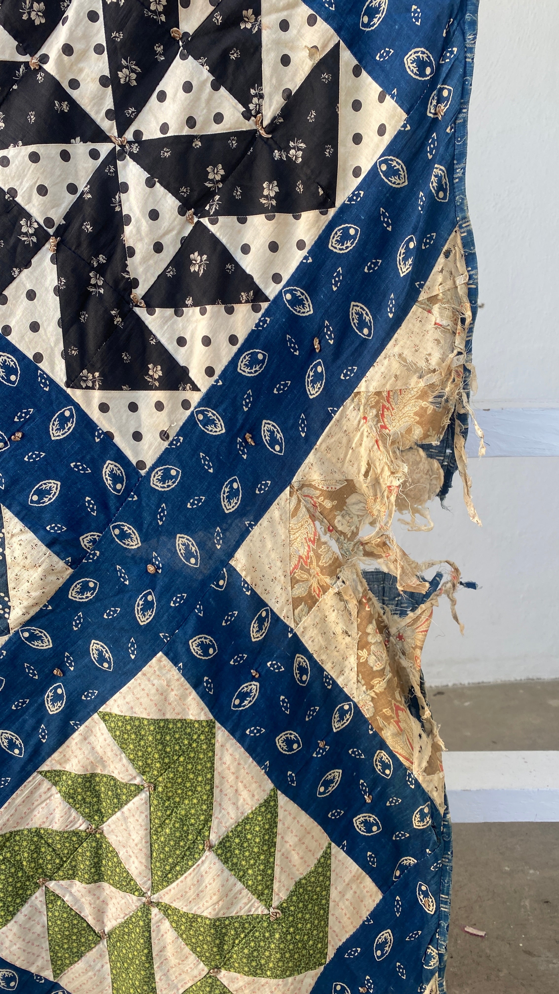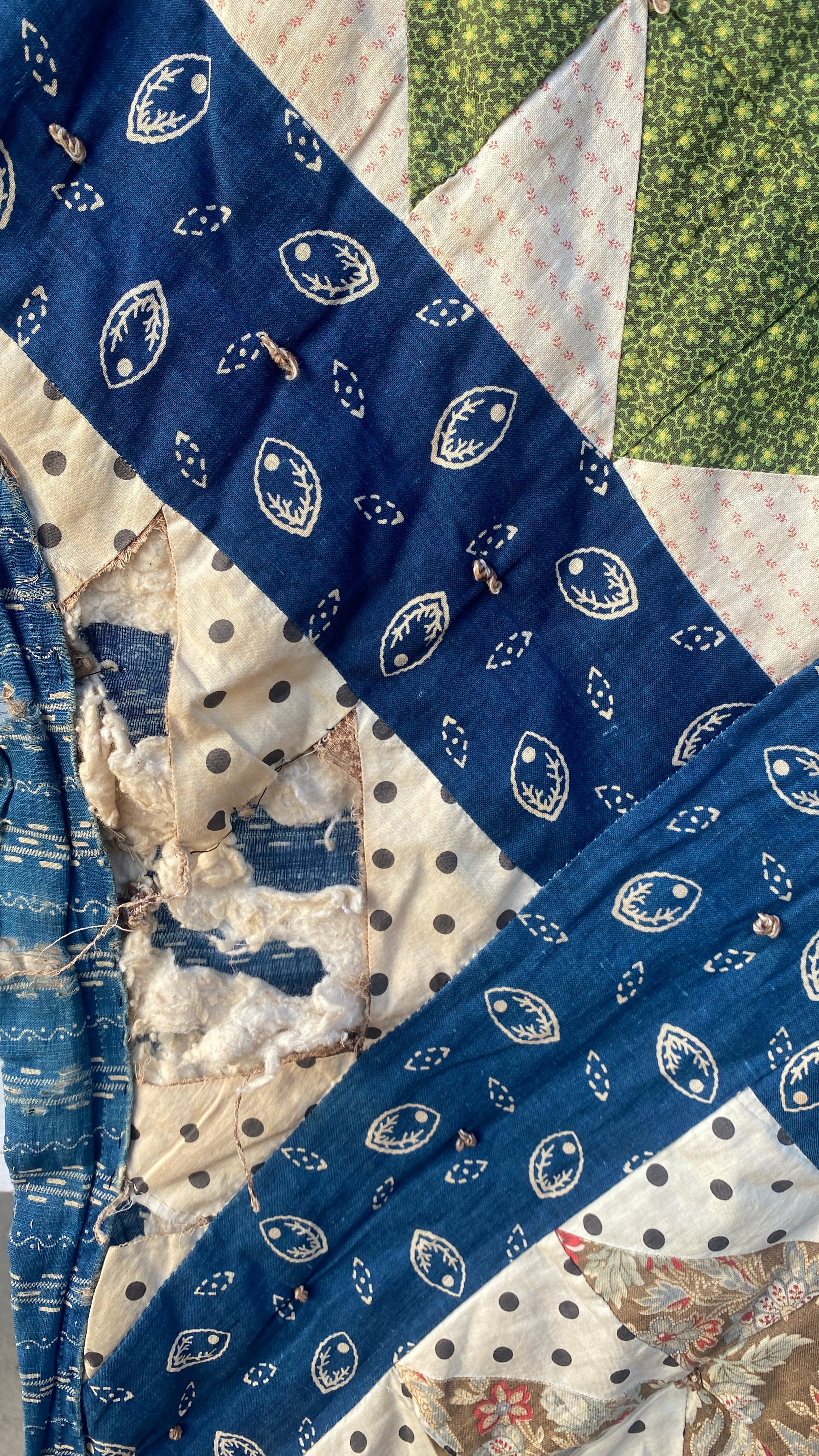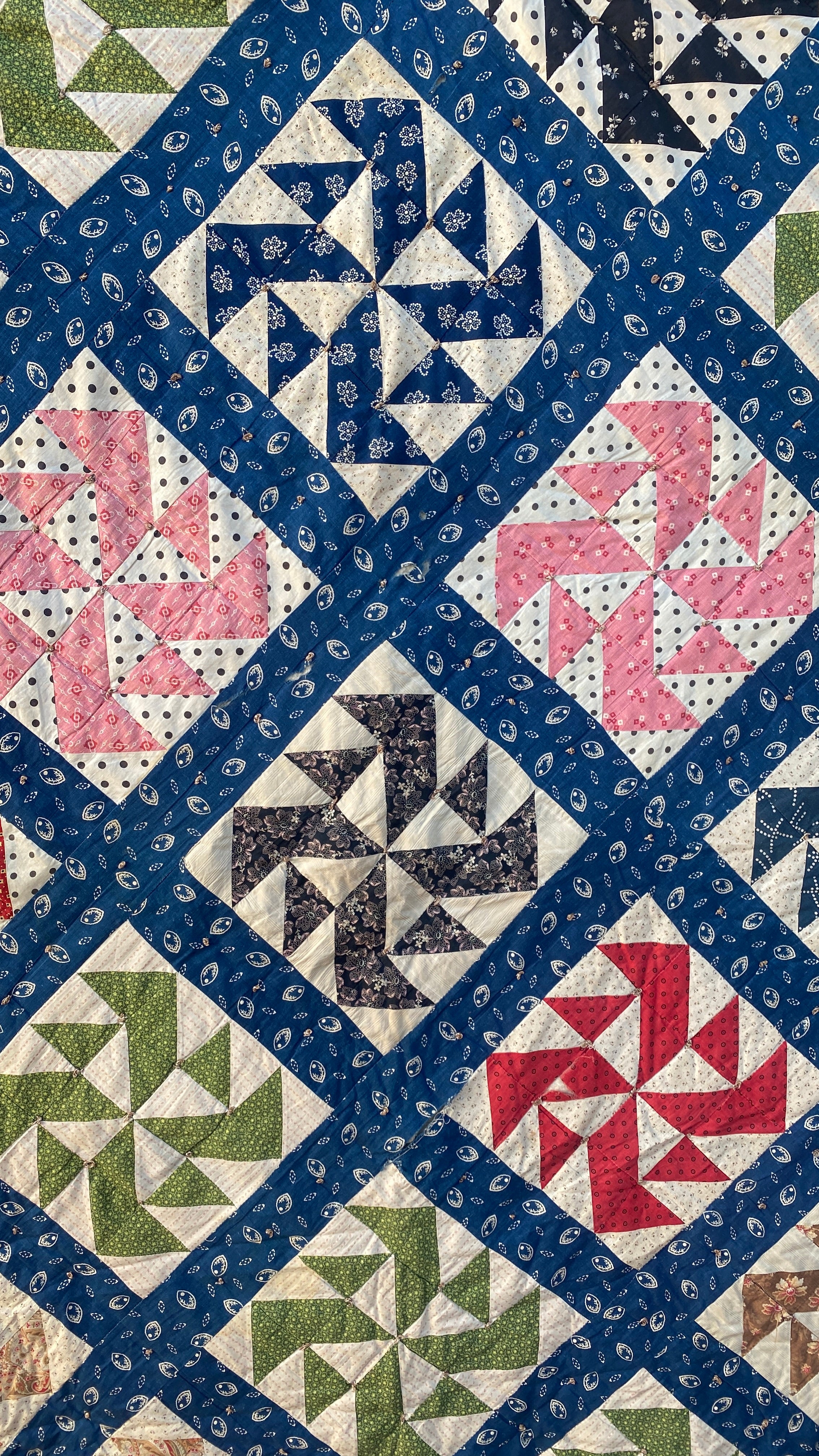 A very old Pinwheel quilt filled with a wonderful selection of very early calico and cotton prints. Very soft fabrics in beautiful bright colors. Fabrics remind me of prints from little girl's dresses. There is fabric loss and a few ripped areas which expose the wool batting. The batting is thicker - made for warmth! There are loose seams here and there. Wonderful indigo blue backing on quilt. I would probably consider this a cutter - unless you just want to fold this one up and add to your quilt shelf!
