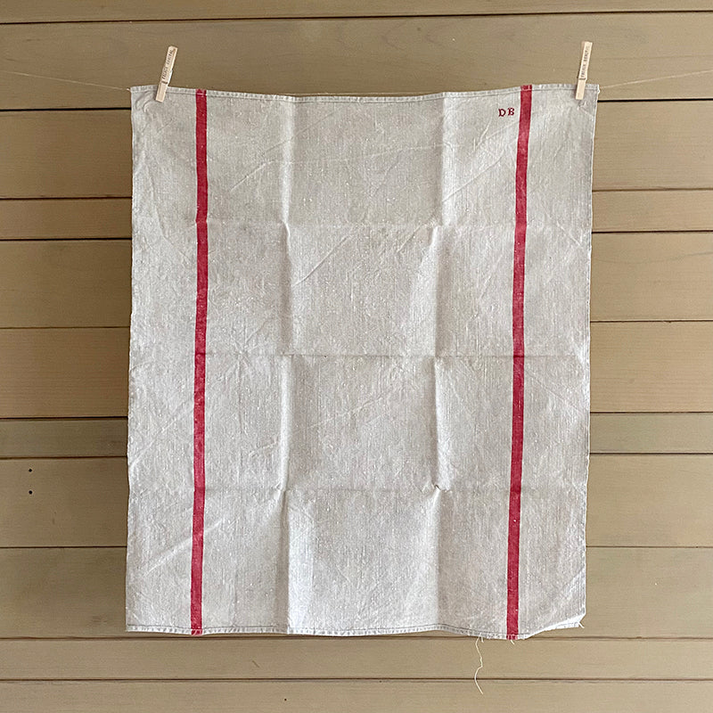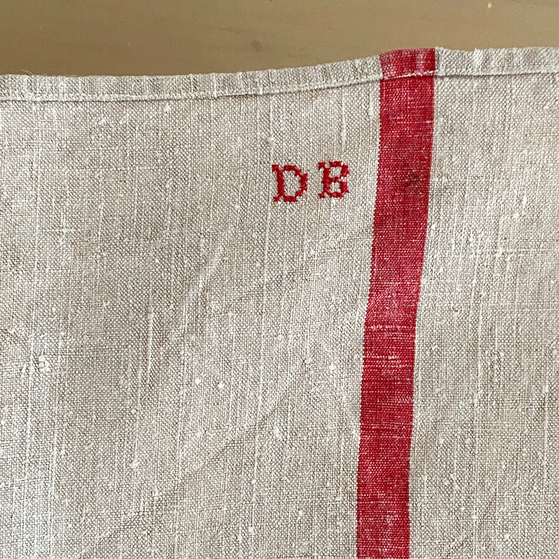 These very old natural linen torchons all have a beautiful red stripe running down both sides. A small red DB monogram has been stitched on each towel. These torchons could use a good washing and they will soften up a bit more. I don't see this color linen much anymore - this is the early stuff - probably late 1800's.