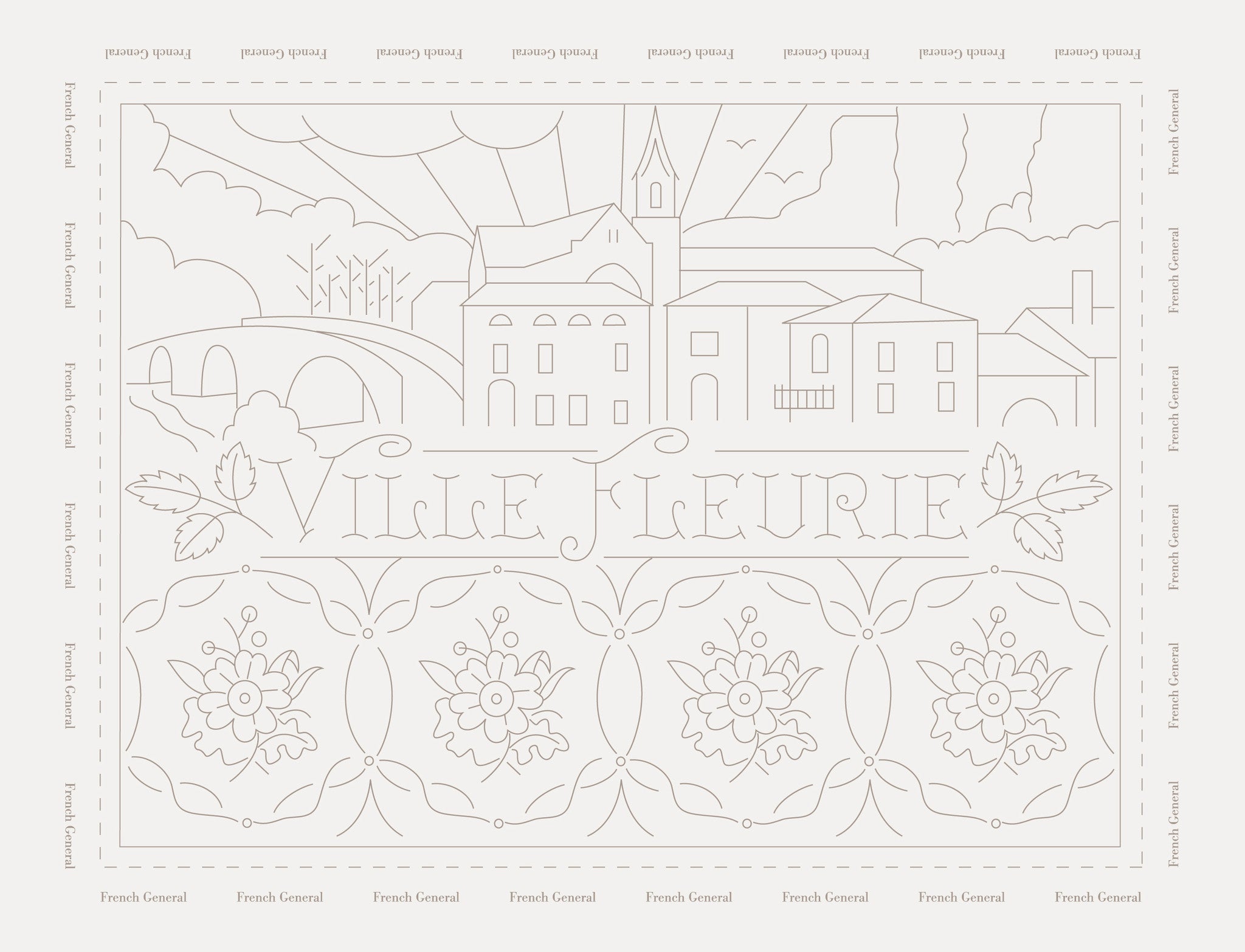 A pretty line drawing embroidery sampler with the coveted four-flower award given to the Ville Fleurie villages in France. Perfect for a friend, sister or a gift to yourself. Printed on dove grey linen.