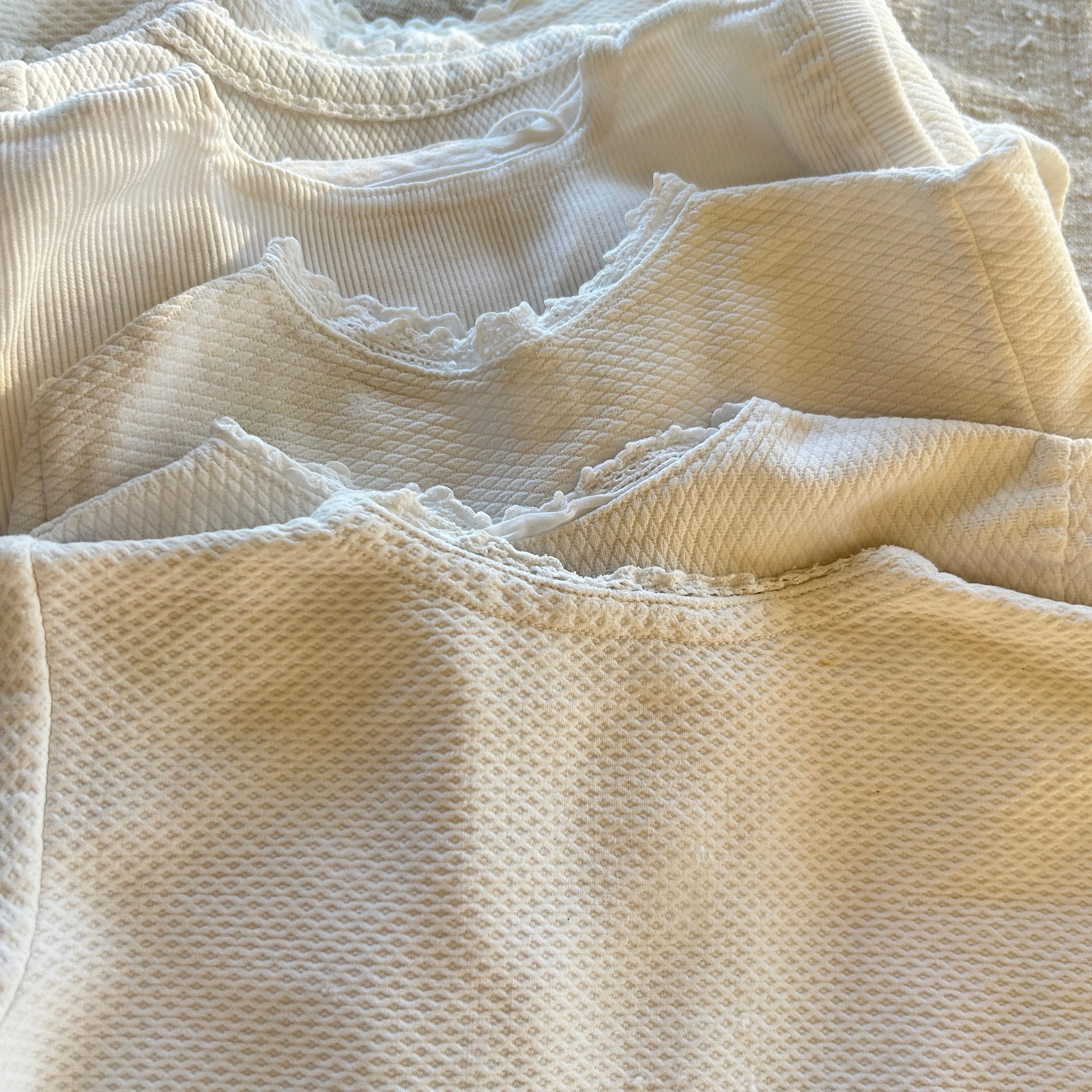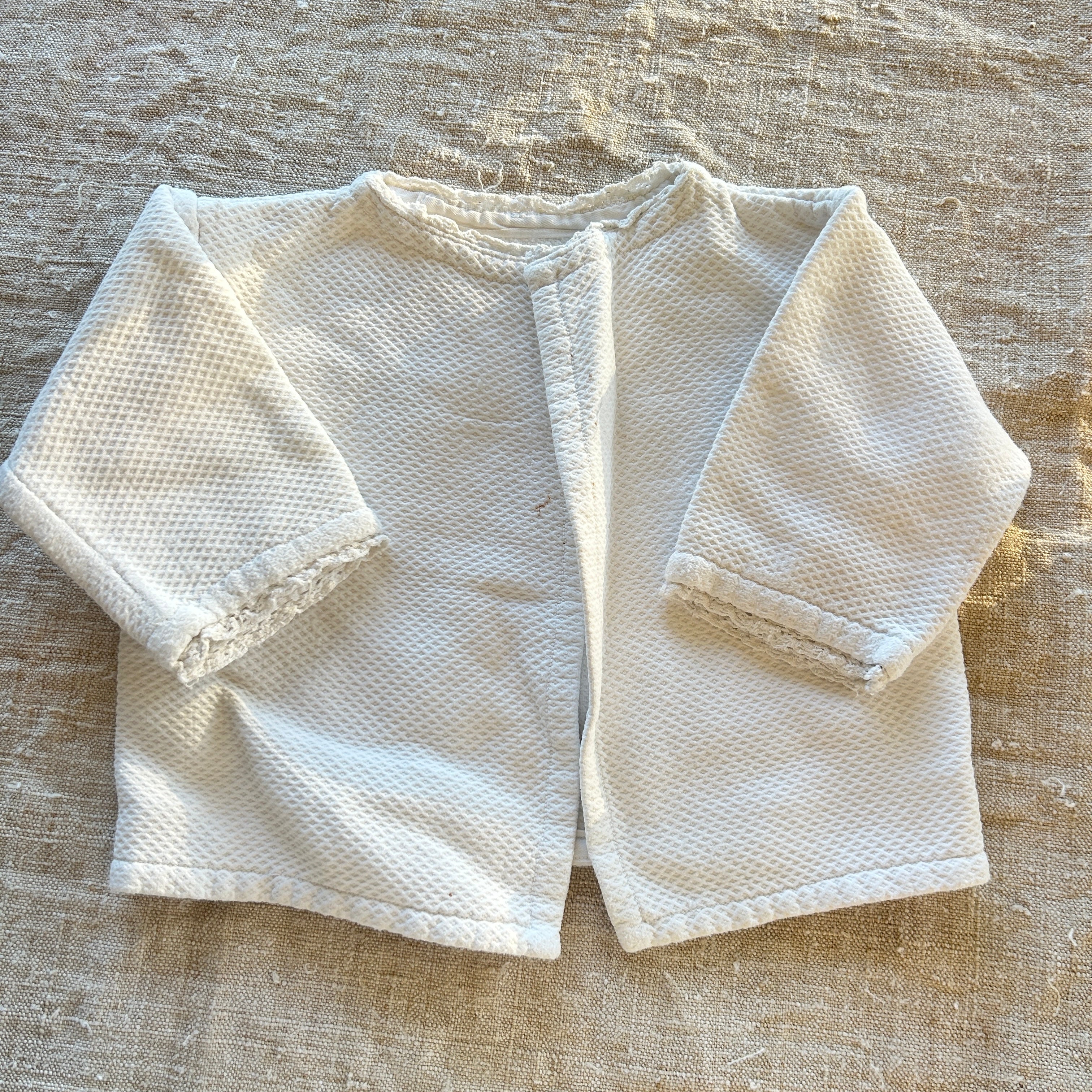 These wonderful French baby jackets were all found in the same armoire - probably all from one baby's layette. They look like about  a small 6 month old in size. Each jacket is slightly different - most do not have buttons. These can be used as is - or embellish with your hand-stitching as a sweet baby gift. Some need small repairs.