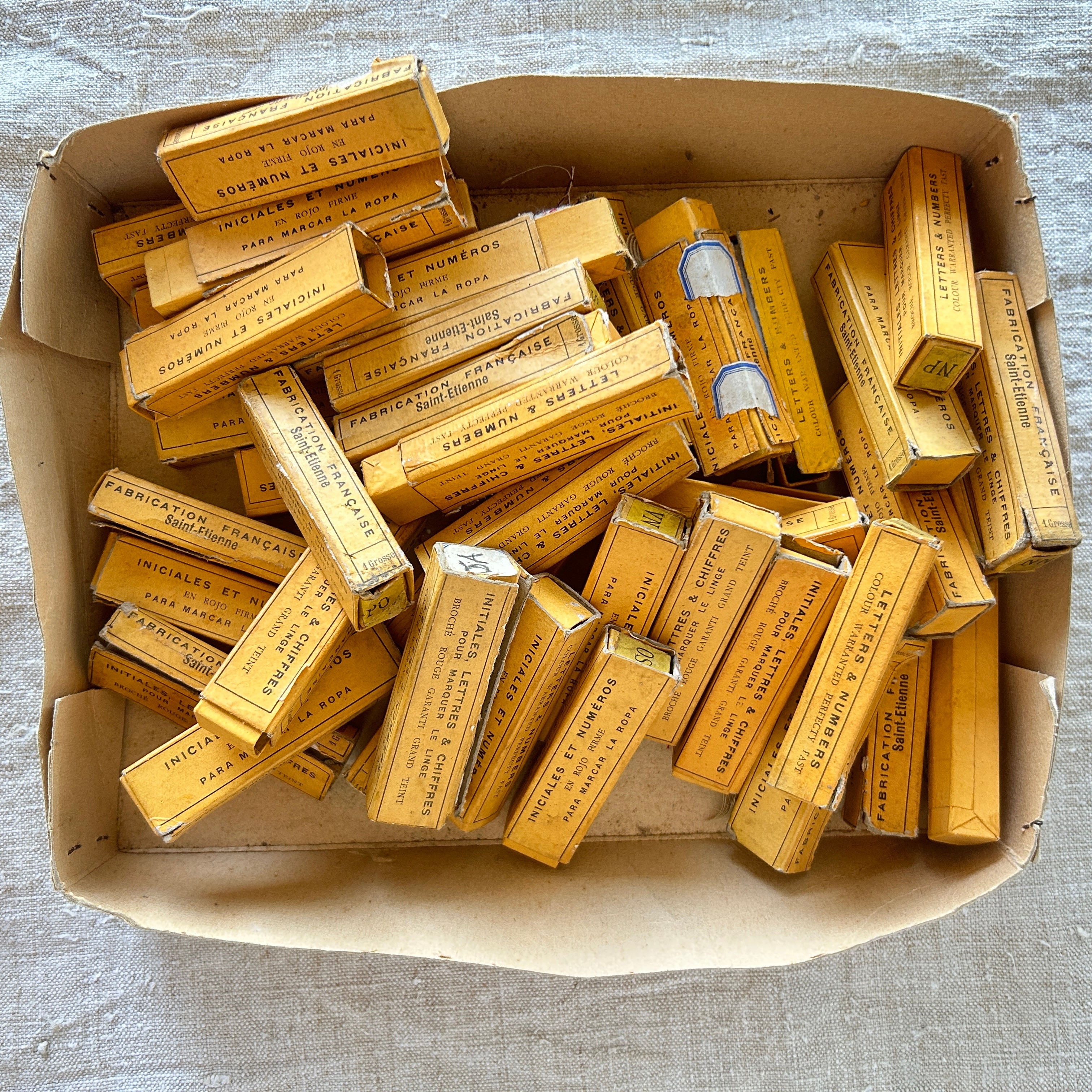 These old boxes of vintage French laundry tape were bought at Isabelle's Brocante in Lagupie. Originally used as clothing markers, these woven monogram tapes are dated to the 1920's and 1930's - and some tapes are in fragile condition.