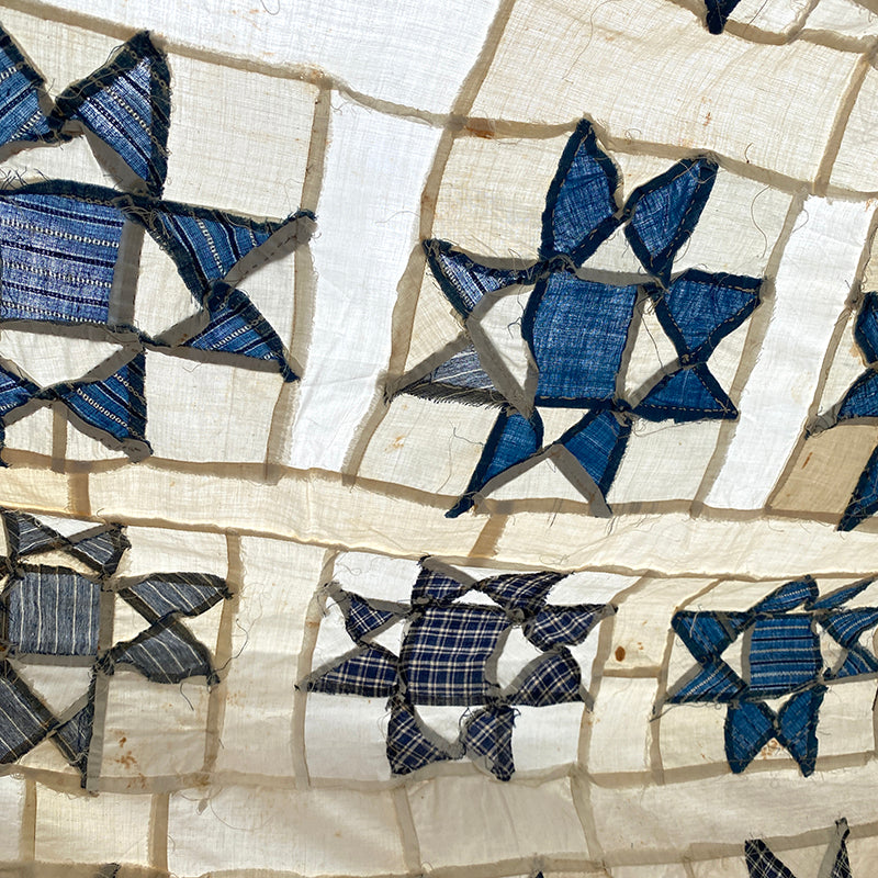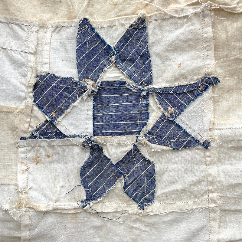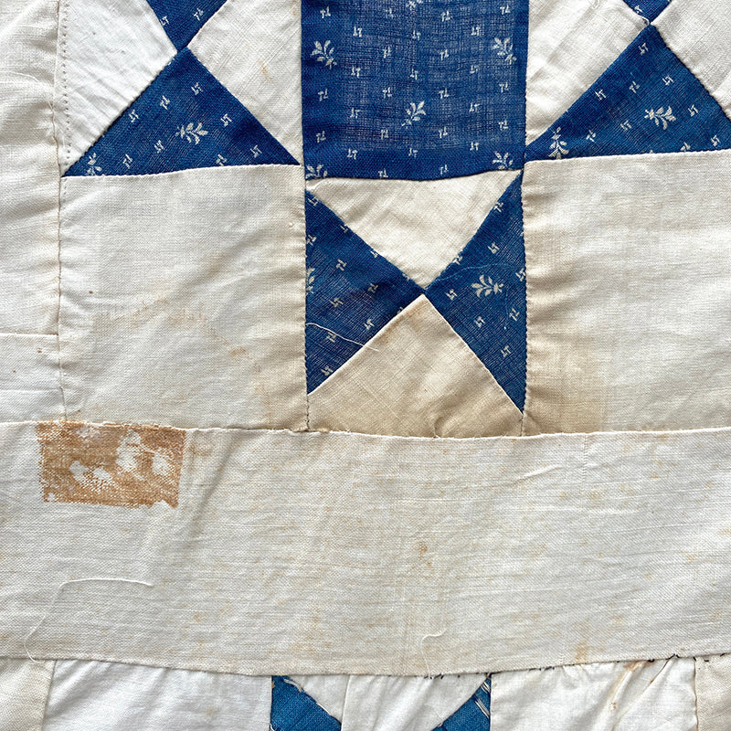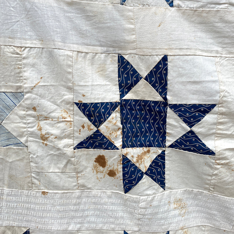 Antique Ohio Star Quilt Top made out of indigo and cadet blue with cream cotton sashing. This very old, very well loved top is hand pieced and in poor condition with overall toning, spots, split seams and discolorations. The top could use a good soaking and might be cut up and used for other projects. You can feel the history in this old top - and you know it has heard many stories!