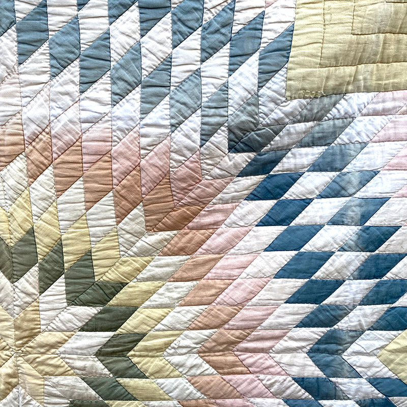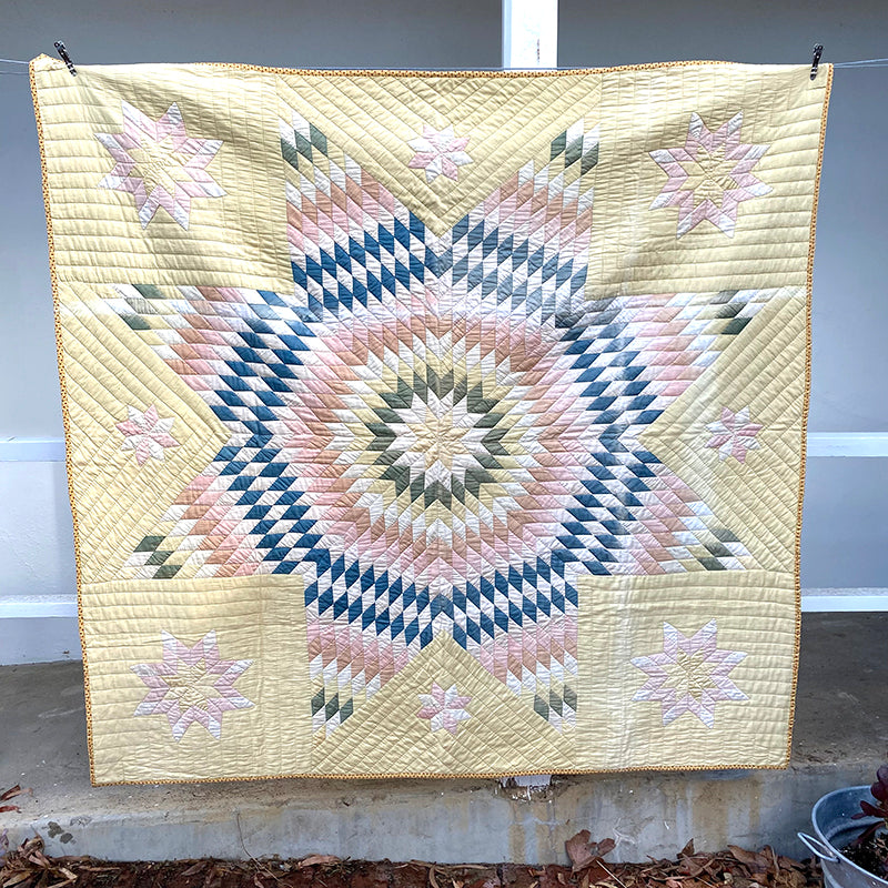 Stunning, soft, very light Lone Star Quilt made out of the prettiest pastel cotton sateen fabrics. Hand pieced and hand quilted with a few small tears here and there - but still in wonderful shape! The back and binding is a beautiful ditsy yellow with red flowers - very different from the front.