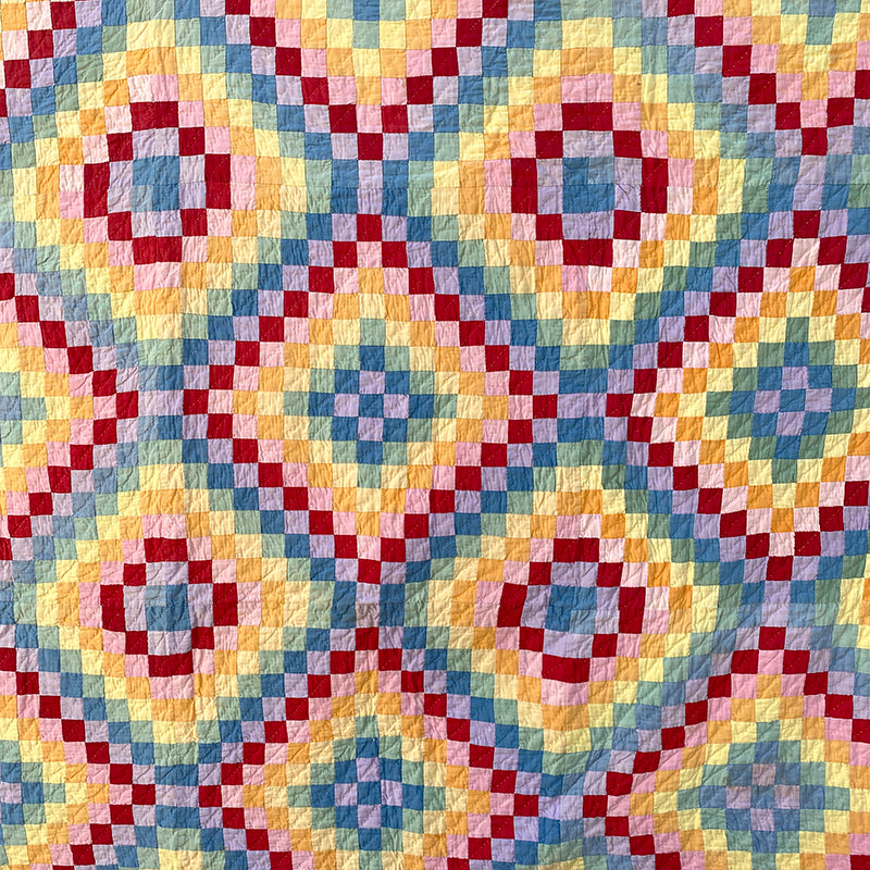 This stunning antique Trip Around the World Quilt is made out of hundreds of 1" squares. Brightly colored cotton in all the right shades: red, orange, yellow, green, blue, and violet (almost Roy G. Biv!) This quilt is all hand-sewn and quilted. With a very thin batting and a self-binding, this quilt is in great condition. Signed and dated on the back by Mrs. Rasinis - thank you!