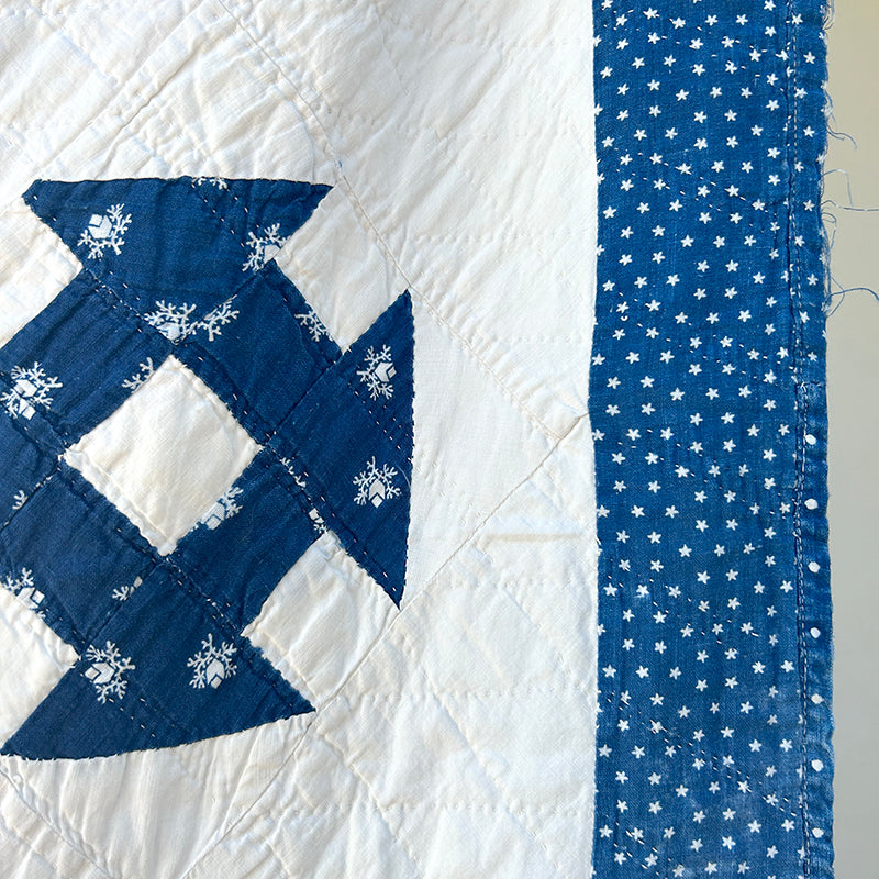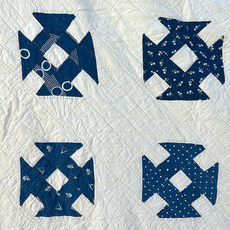 This antique quilt might be called an Shoo Fly Quilt - or it is a variation on the Shoo Fly block. Made with early American indigo blues and a white base, this quilt is in pretty good condition but could use a bit of care. Fraying edges on the binding throughout. There is a stain and a faded corner - which could be repaired by adding a small patch of blue and white polka dot fabric. Almost non-existent binding (maybe there is something inside?!) gives this quilt a very soft and sweet feeling. Lots of beautiful fabrics in this one!