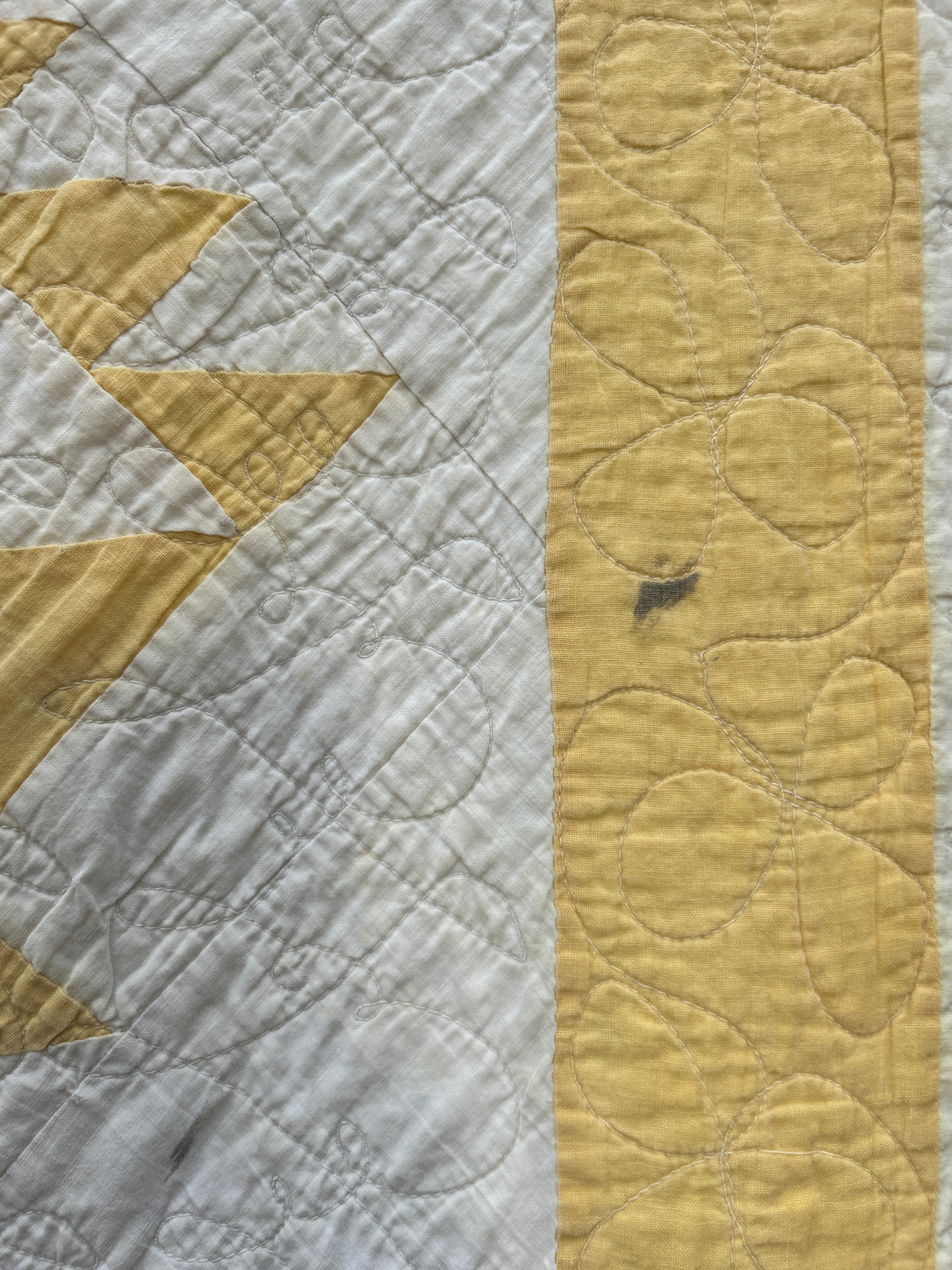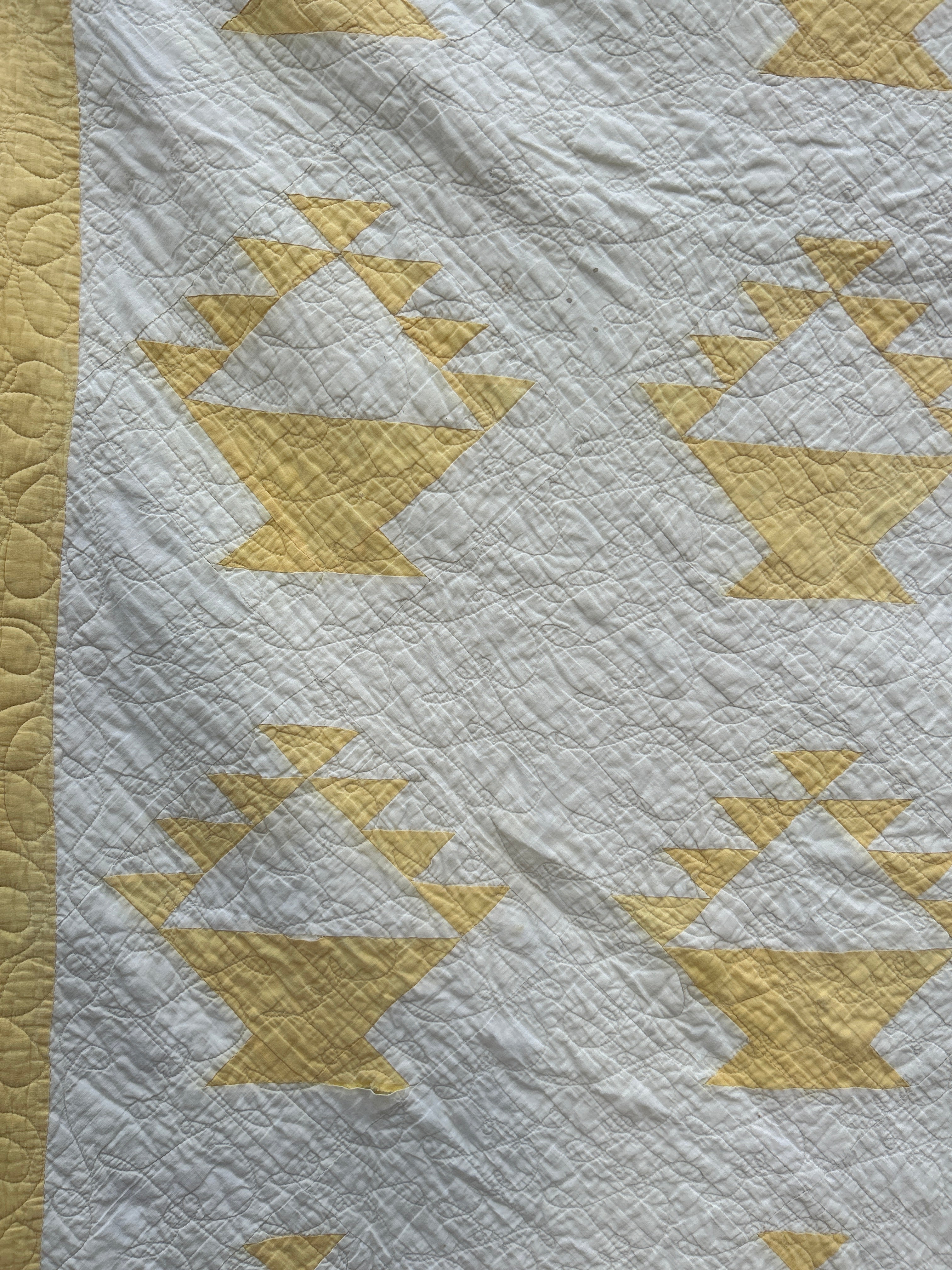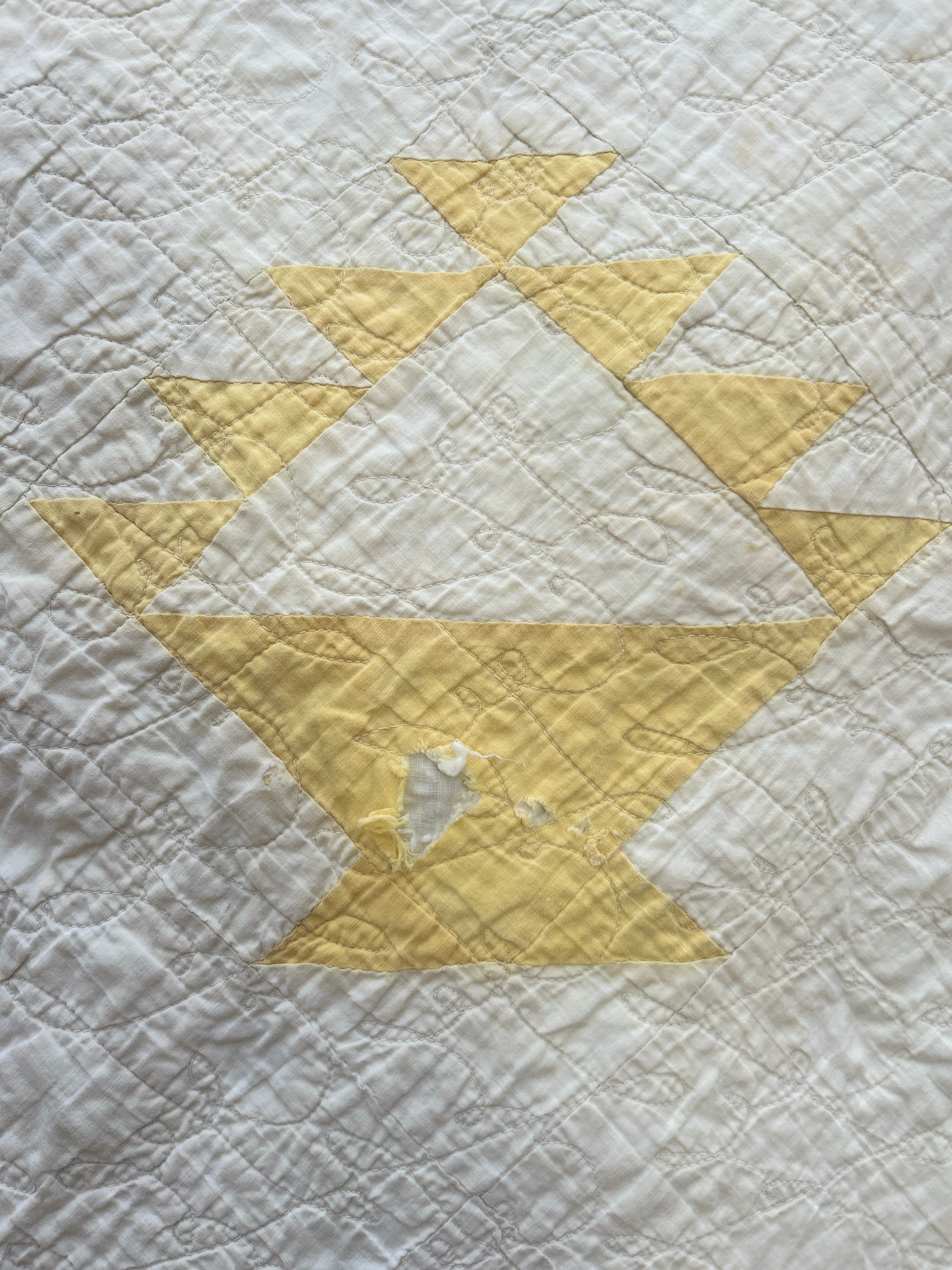 A sweet vintage, yellow and white basket quilt with just a few small areas in need of repair. This quilt also has a few spots which might come out with a good soaking. Machine pieced and quilted with a hand sewn binding.