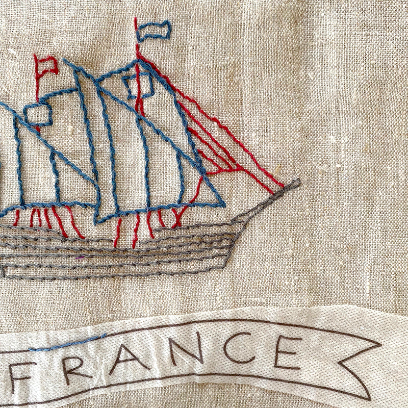 A bag of 12 French Souvenir designs for you to embroider onto your favorite bag, jacket or piece of linen! These fun designs were all designed by us for our workshops in France this summer. Simply peel off the back paper and stick the design onto your base, stitch the design using your favorite colors and stitches, and when you are completely finished stitching, simply run under cold water and the paper template will disappear.
