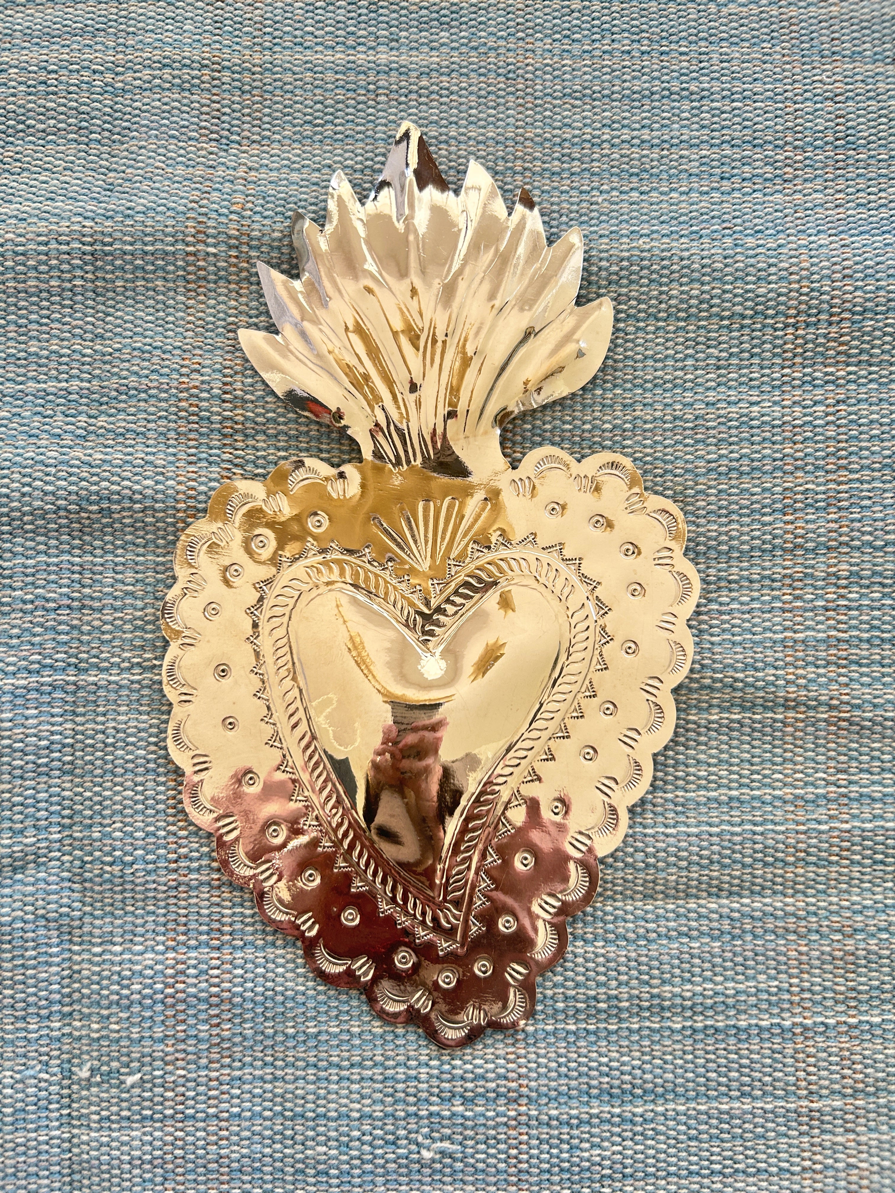 A beautiful large milagro heart - handmade and hand-stamped. These decorative and symbolic charms are part of a tradition of Mexican folk art, where they represent miracles, good luck, protection, and gratitude, and are often in a "sacred heart" style. They can be used as wall decor, or as talismans.