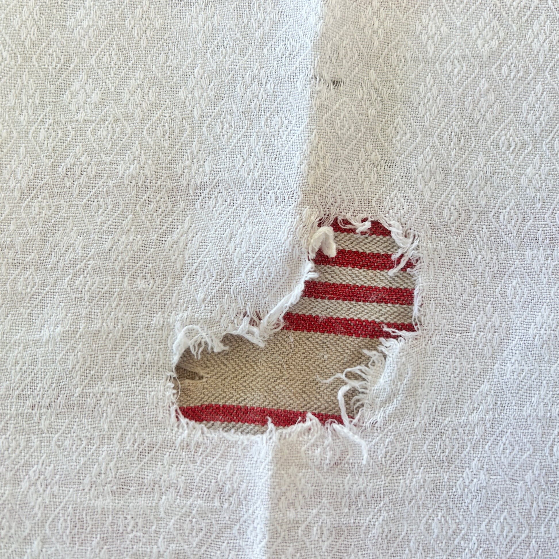 Two early Béarn household cloths - pure white linen with woven stripes. Silky linen with traditional geometric woven design and indigo blue stripes. Towels have a small red embroidered JP monogram. One towel is in near perfect condition with one small home to be repaired and the second cloth has one large hole and a couple of small holes which need to be repaired.