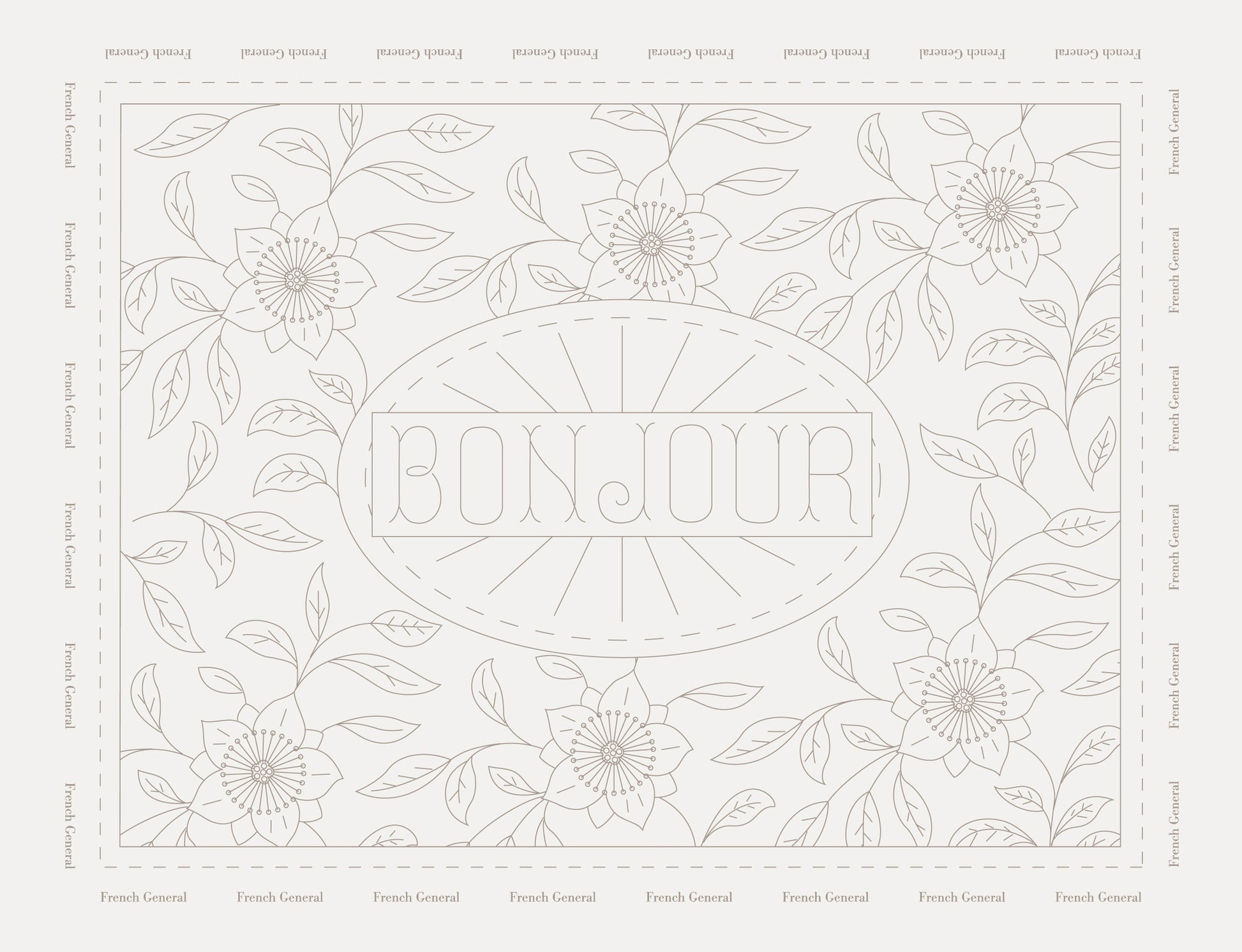A pretty line drawing embroidery sampler of an antique French textile. Perfect for a friend, sister or a gift to yourself. Printed on dove grey linen.