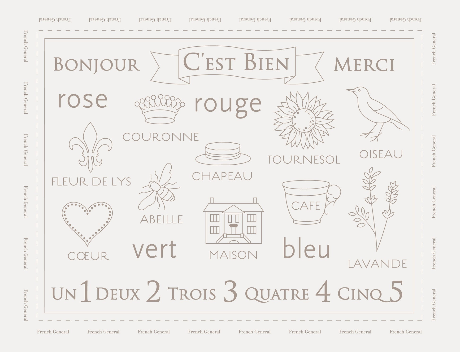 A sweet French embroidery sampler, to help you learn words, numbers and colors. Printed on dove grey linen.