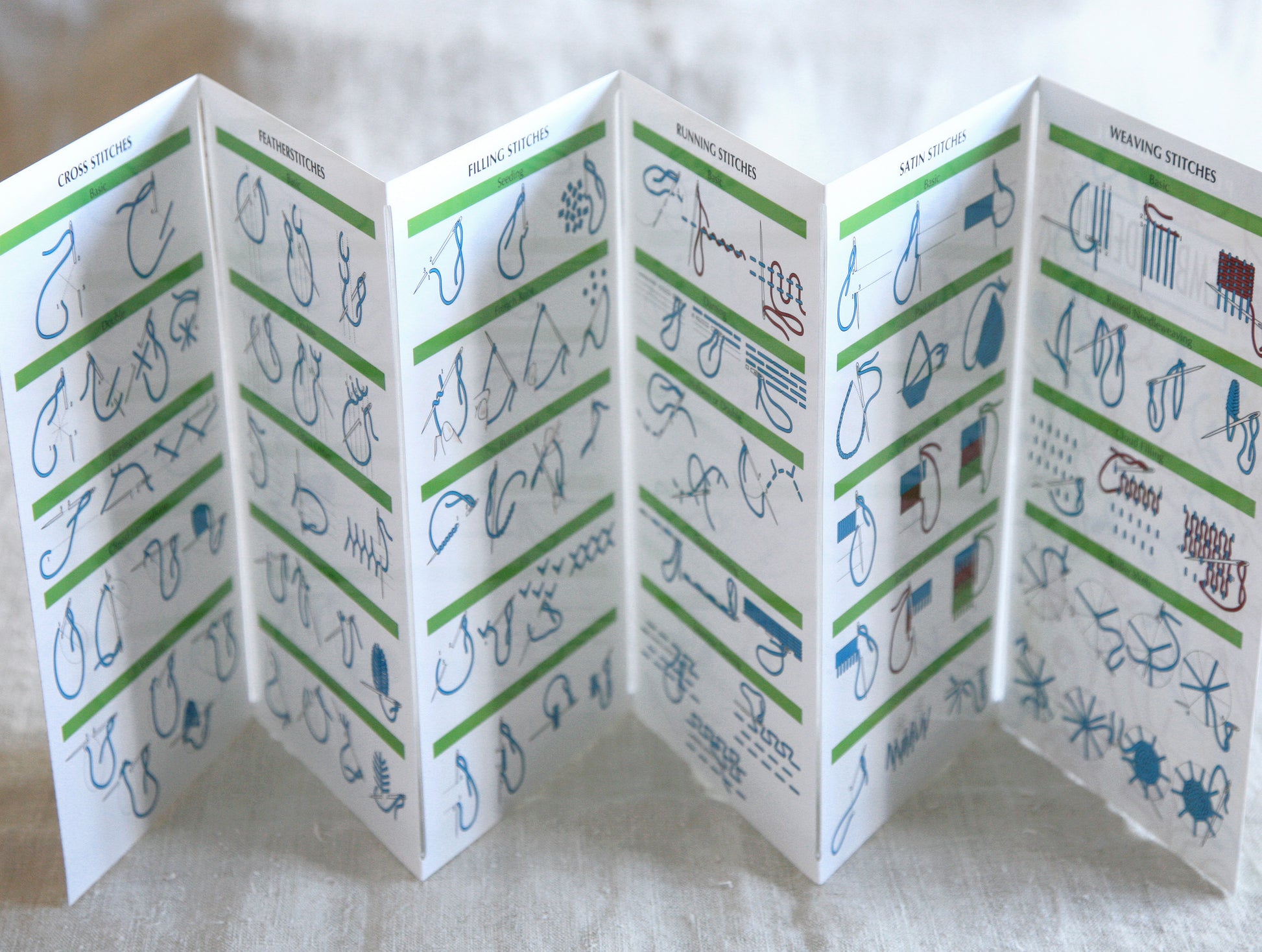 Our favorite embroidery stitch guide book! Laminated pocket guide which folds out with 10 pages of stitches - including some very unusual stitches!