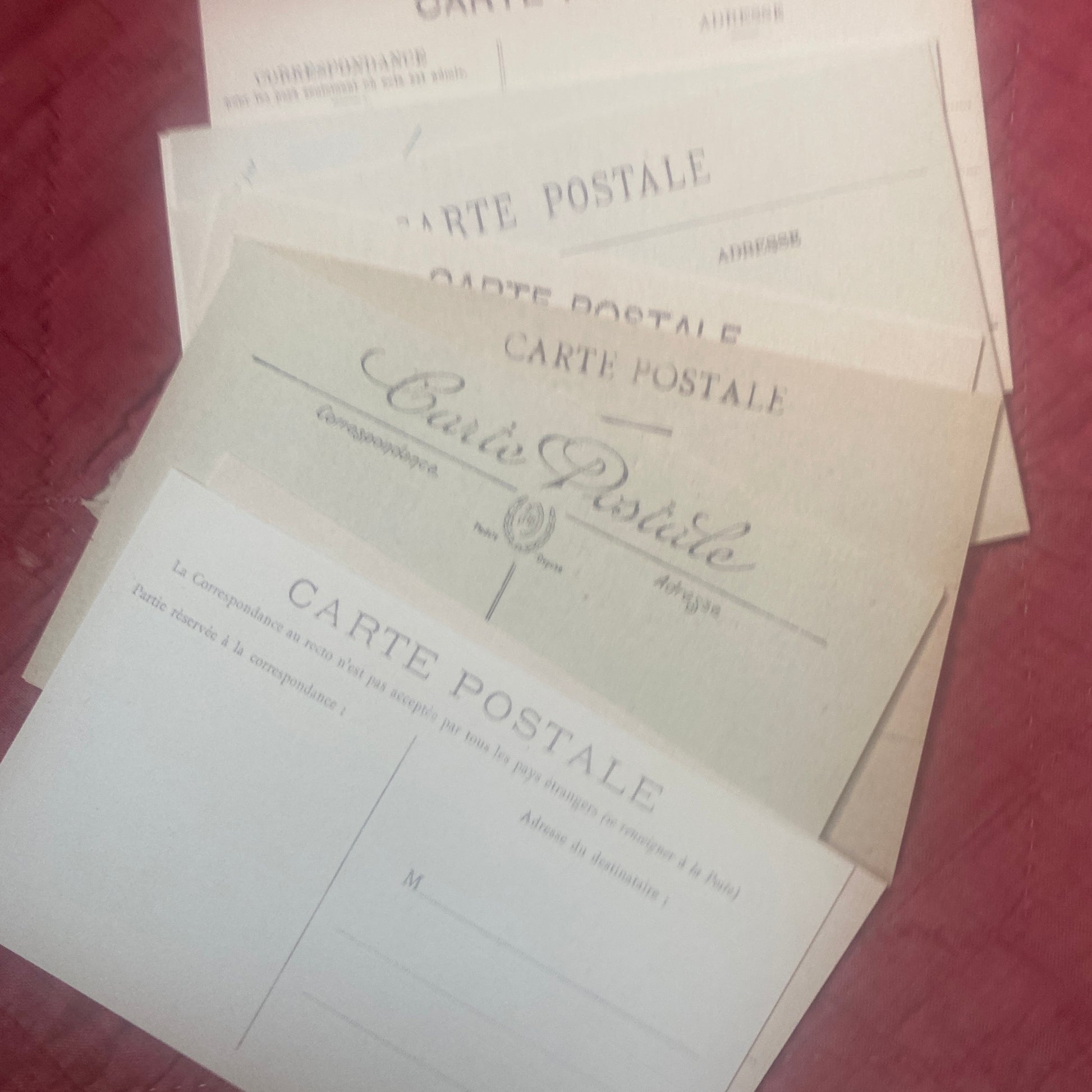 A dozen postcards reproduced onto card stock. One side has original old French type and space for address and the other side is blank for you to collage or write your note.
