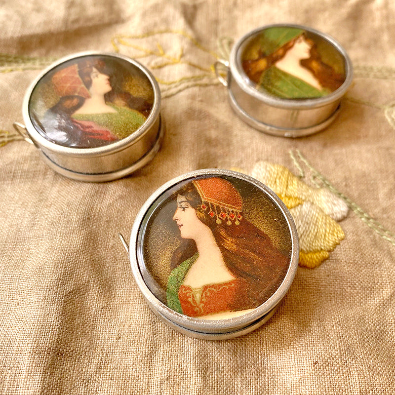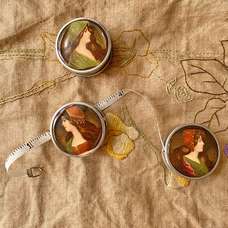 These aluminum tape measures, with cloth tape are decorated with a fair maiden profile on top and a striped design on back. To use, simply press button on back and pull tape measure out - release button to retreat tape measure.