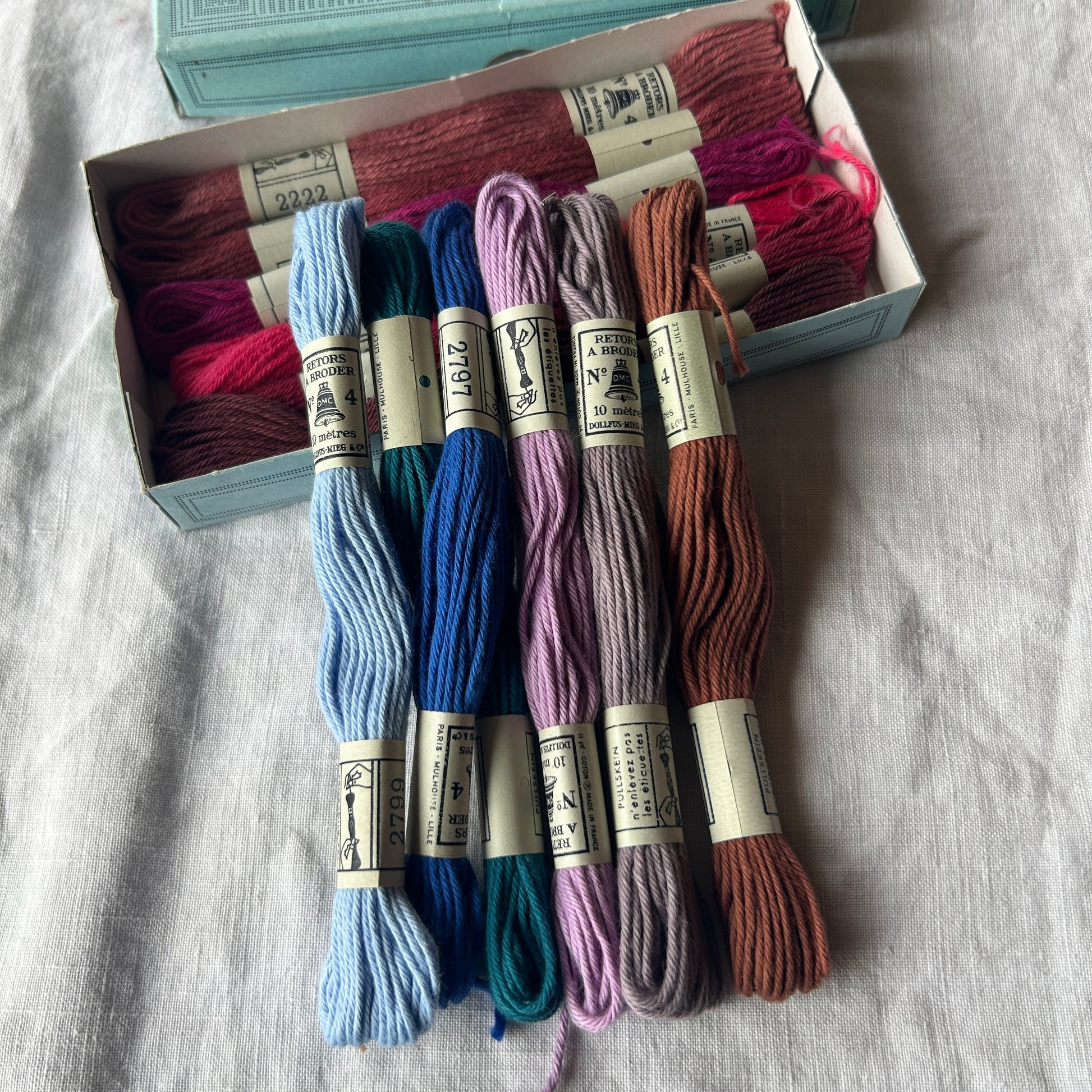 This fun bundle of 12 skeins of vintage DMS cotton embroidery threads was found in France.