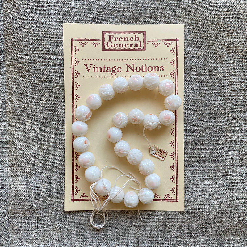 Vintage white glass pressed beads with a very subtle peachy wash on each bead.