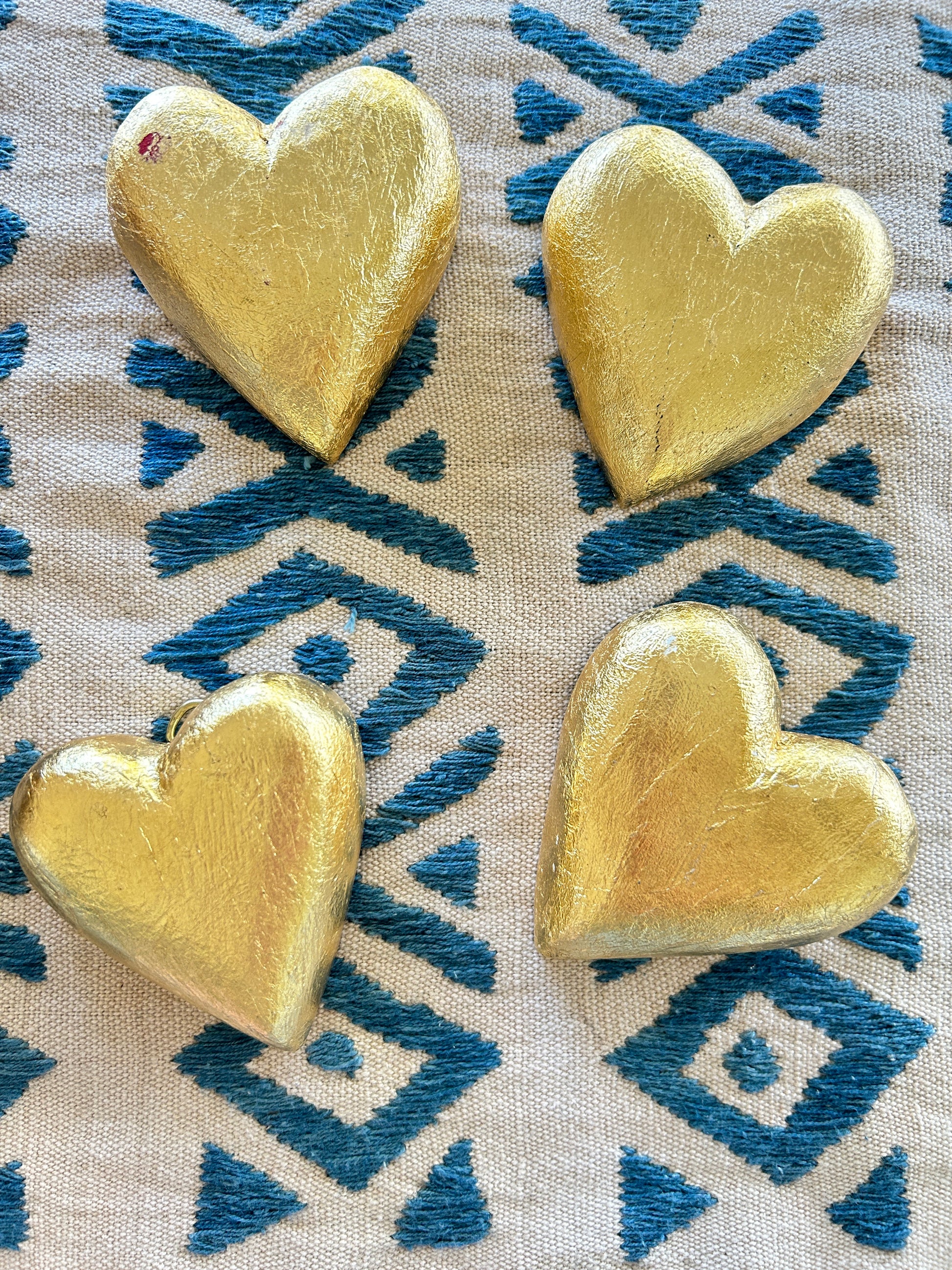 A handmade gold-leafed wooden heart with hook on back to hang. A Mexican gold leaf wooden heart is a handcrafted item from Mexican folk art, often referred to as a Sacred Heart, symbolizing Hope, Love and Protection. These hearts are frequently hand-carved and painted, with the gold leaf being a key decorative element.